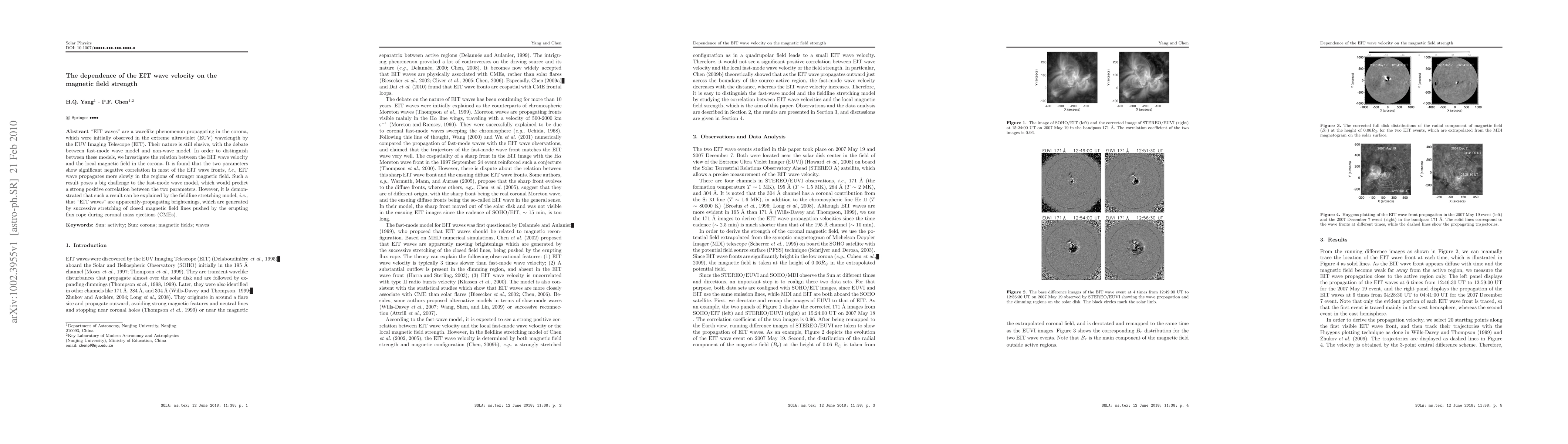 This study investigates the relationship between the EIT wave velocity and magnetic field strength in the corona, finding a significant negative correlation that challenges the fast-mode wave model. Instead, the results support the fieldline stretching model, suggesting EIT waves are brightenings caused by magnetic field line stretching during coronal mass ejections.