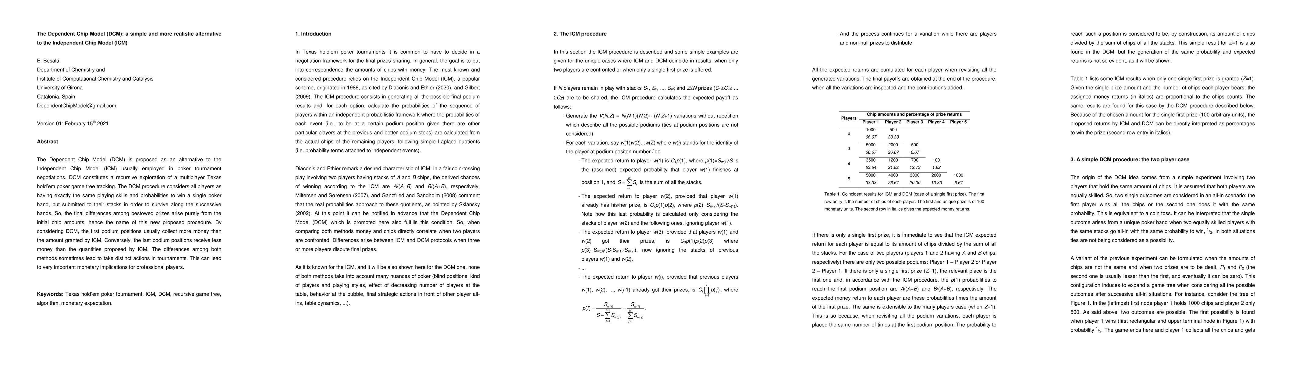 The Dependent Chip Model (DCM) is introduced as an alternative to the Independent Chip Model (ICM) in poker tournament prize distribution. DCM considers players' chip stacks' impact on their survival probability in each hand, leading to different prize allocations, with top players potentially receiving more and bottom players less than ICM suggests. This discrepancy could influence in-tournament strategies and have significant financial implications for professionals.