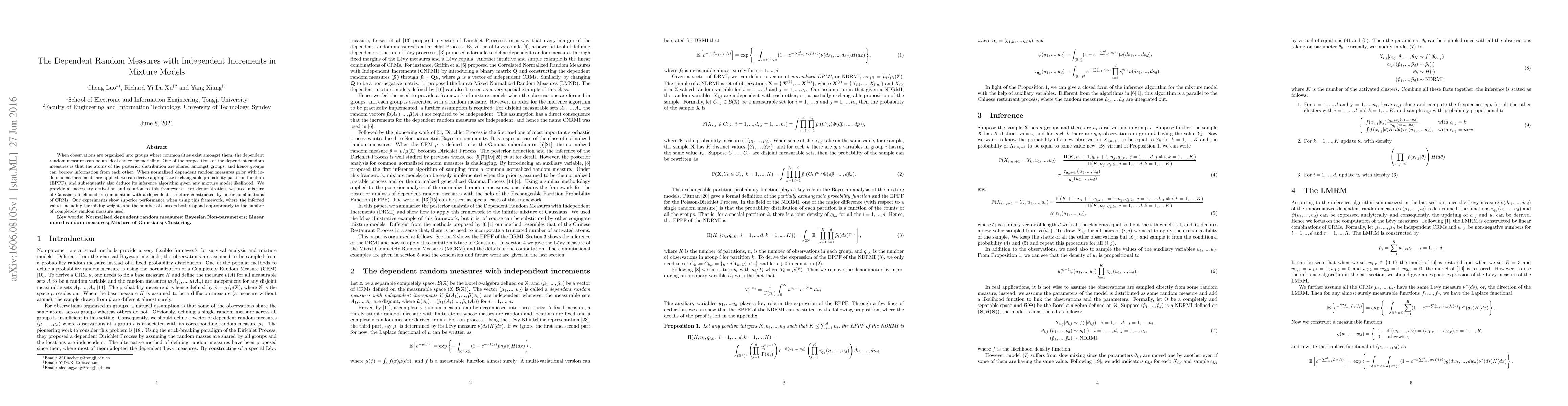 This paper proposes a framework for modeling mixture models with dependent random measures, allowing groups to share information and borrow from each other. The method achieves superior performance in experiments, particularly when using a combination of Gaussians likelihood and independent increments.