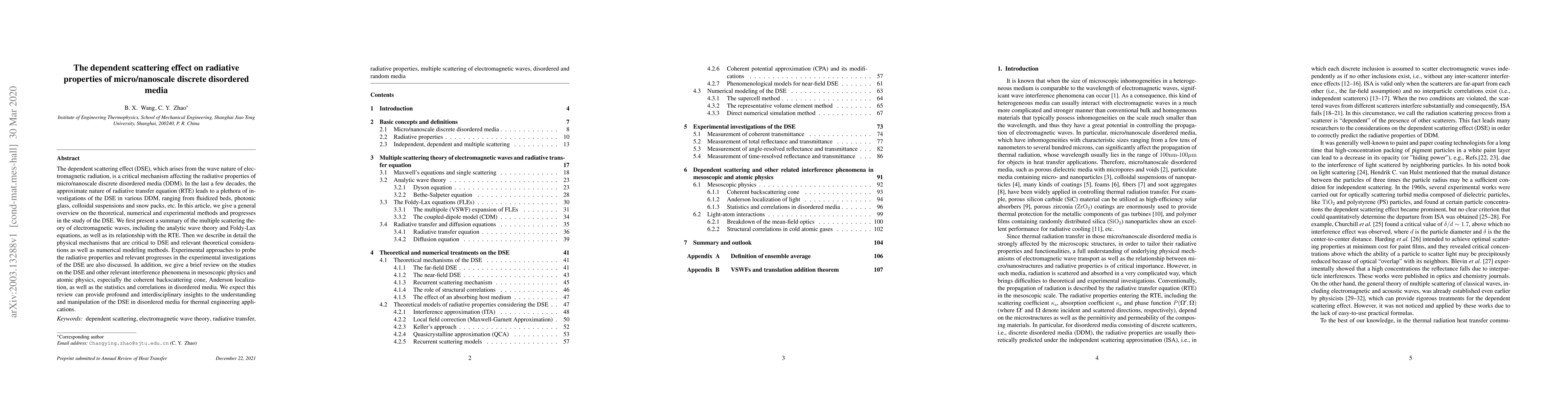 This paper reviews the dependent scattering effect (DSE) in micro/nanoscale discrete disordered media, summarizing theoretical, numerical, and experimental methods used to study its impact on radiative properties. It also covers related phenomena in mesoscopic and atomic physics, aiming to offer interdisciplinary insights for thermal engineering applications.