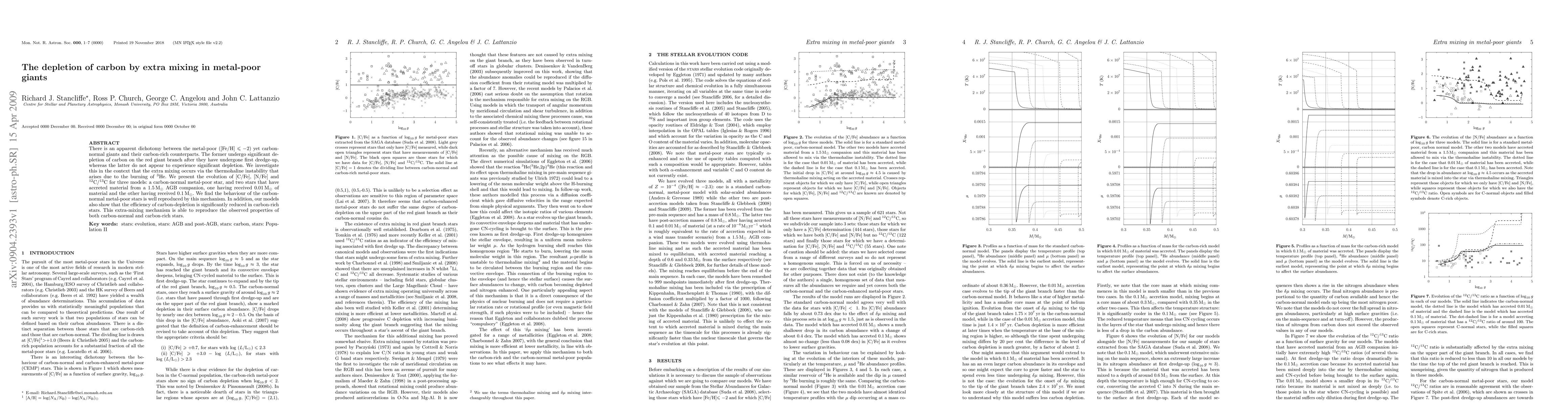 This paper investigates the carbon depletion in metal-poor giants, attributing it to extra mixing via thermohaline instability from helium-3 burning. Models show that carbon-normal metal-poor stars experience significant carbon depletion, while carbon-rich stars do not, supporting the proposed mixing mechanism.