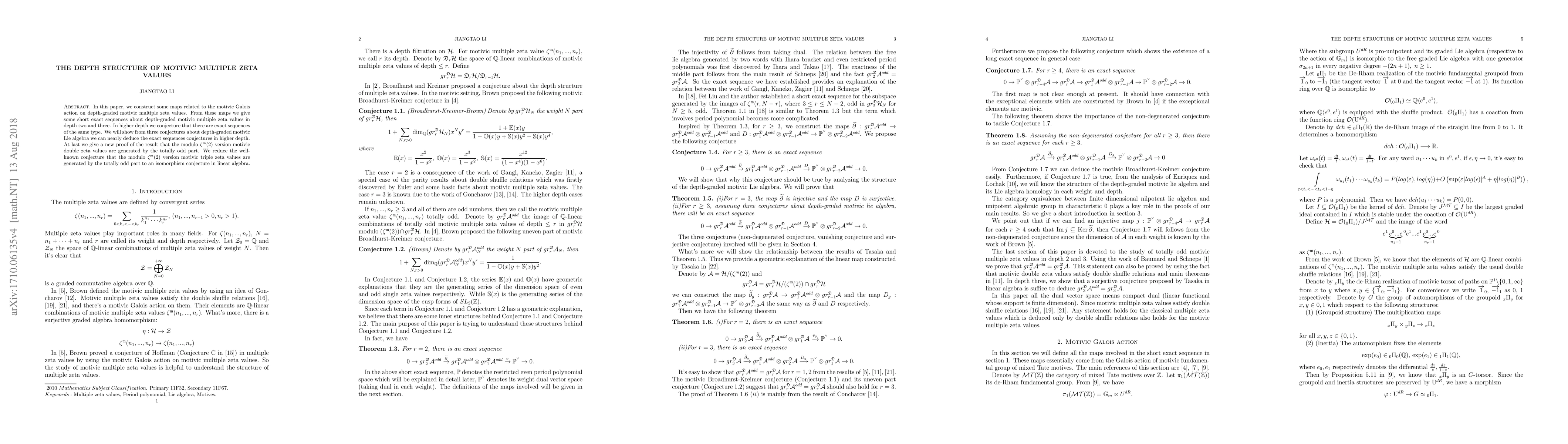 In this paper, we construct some maps related to the motivic Galois action on depth-graded motivic multiple zeta values. And from these maps we give some short exact sequences about depth-graded motivic multiple zeta values in depth two and three. In higher depth we conjecture that there are exact sequences of the same type. And we will show from three conjectures about depth-graded motivic Lie algebra we can nearly deduce the exact sequences conjectures in higher depth. At last we give a new proof of the result that the modulo zeta(2)$ version motivic double zeta values is generated by the totally odd part. And we reduce the well-known conjecture that the modulo zeta (2) version motivic triple zeta values is generated by the totally odd part to an isomorphism conjecture in linear algebra.