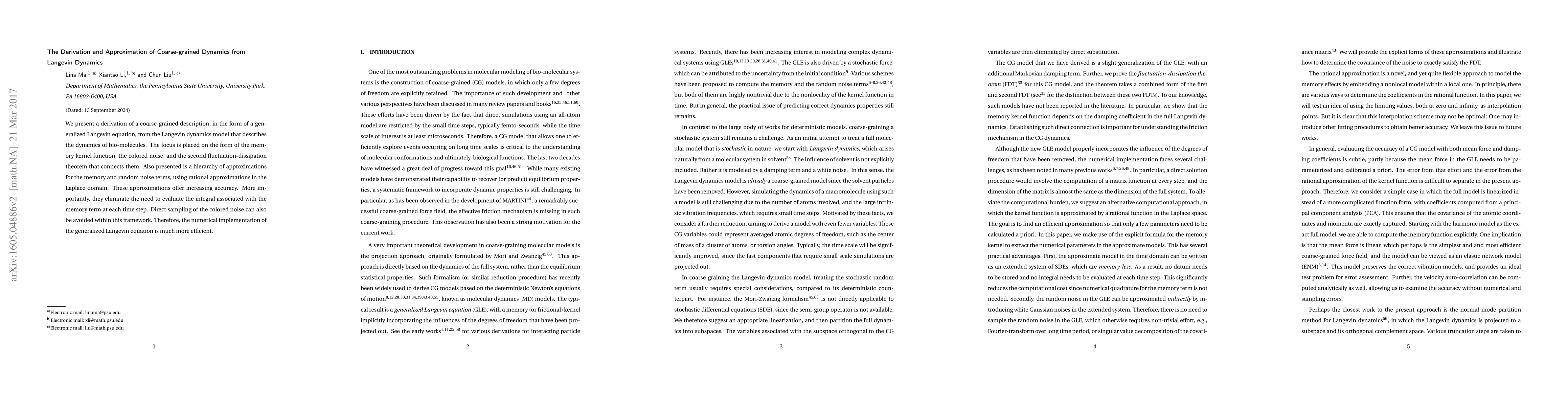 Researchers derived a coarse-grained model from Langevin dynamics, providing a more efficient approach to simulate complex systems by approximating memory kernel function and random noise terms.