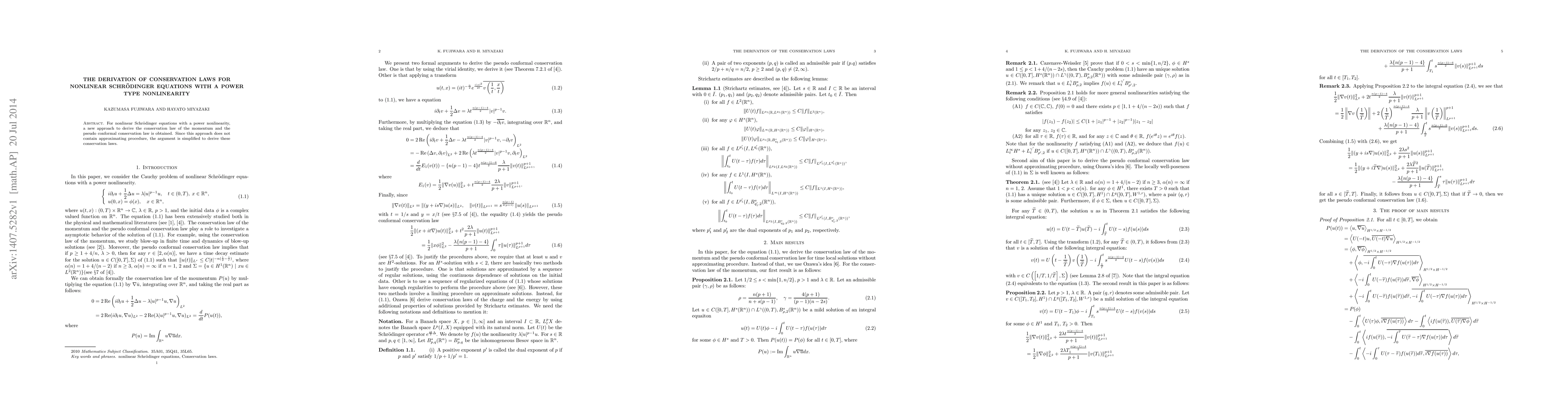This research presents a novel method to derive conservation laws for nonlinear Schrödinger equations with power-type nonlinearity, bypassing the need for approximations, thus simplifying the derivation process.