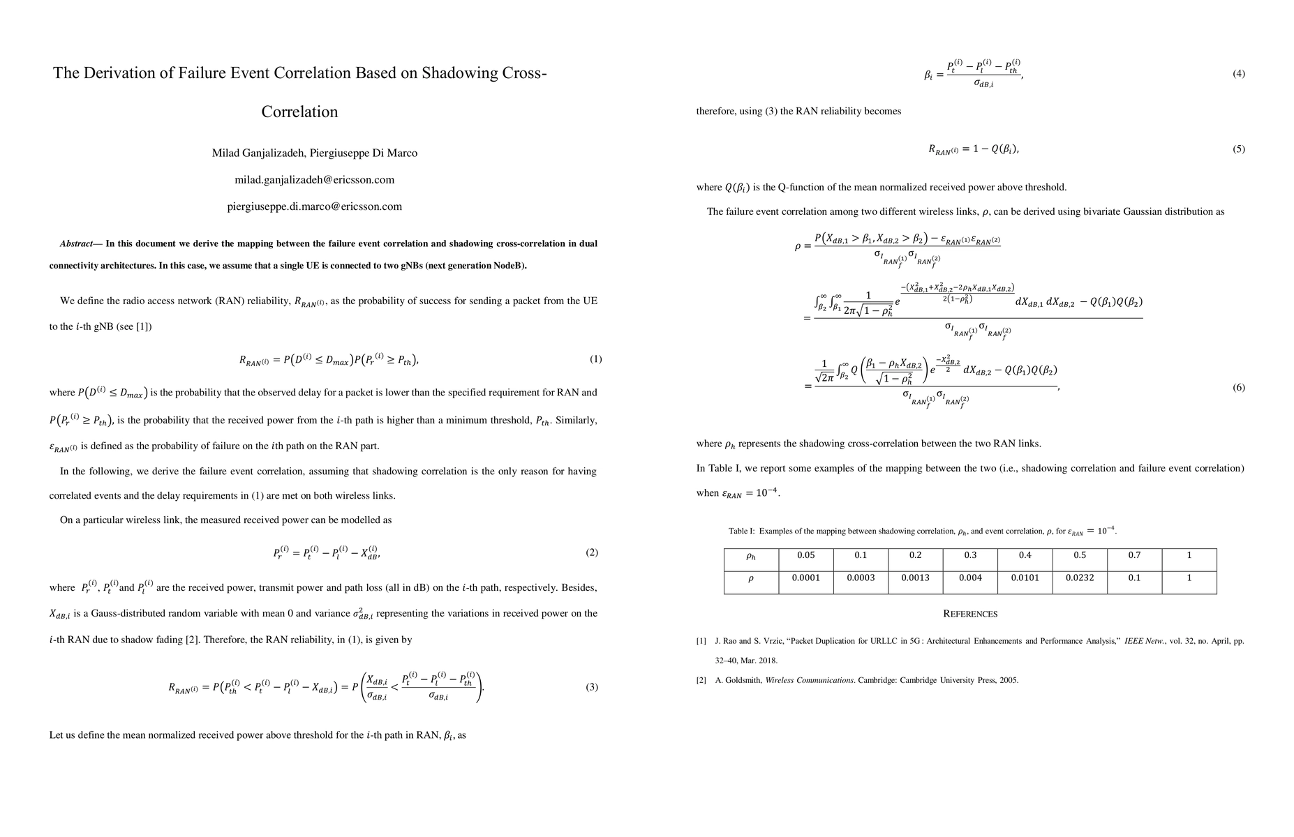 In this document we derive the mapping between the failure event correlation and shadowing cross-correlation in dual connectivity architectures. In this case, we assume that a single UE is connected to two gNBs (next generation NodeB).