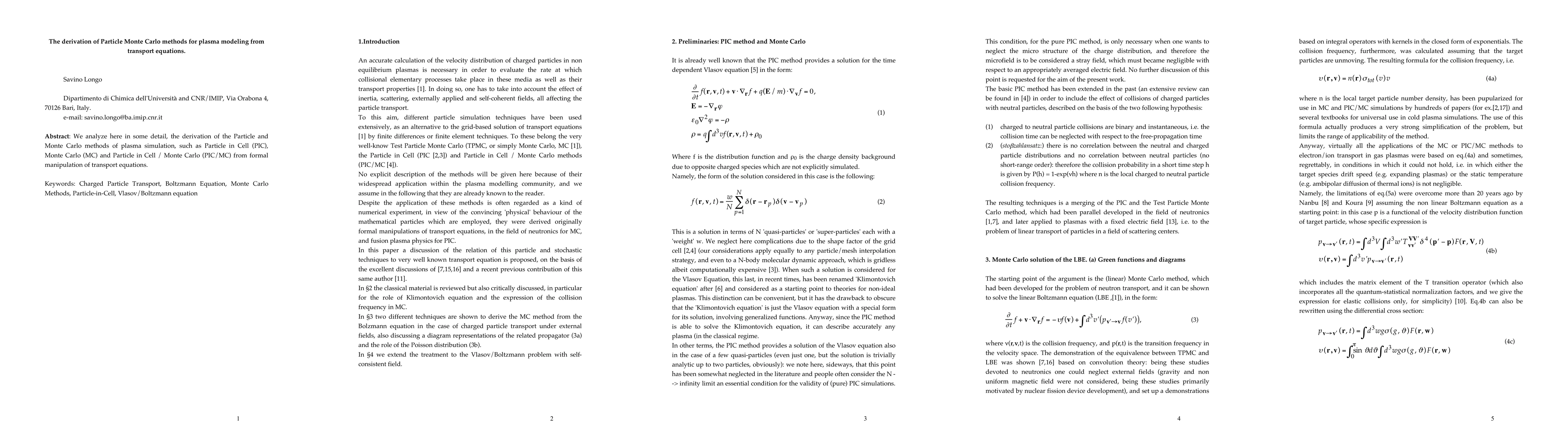We analyze here in some detail, the derivation of the Particle and Monte Carlo methods of plasma simulation, such as Particle in Cell (PIC), Monte Carlo (MC) and Particle in Cell / Monte Carlo (PIC/MC) from formal manipulation of transport equations.