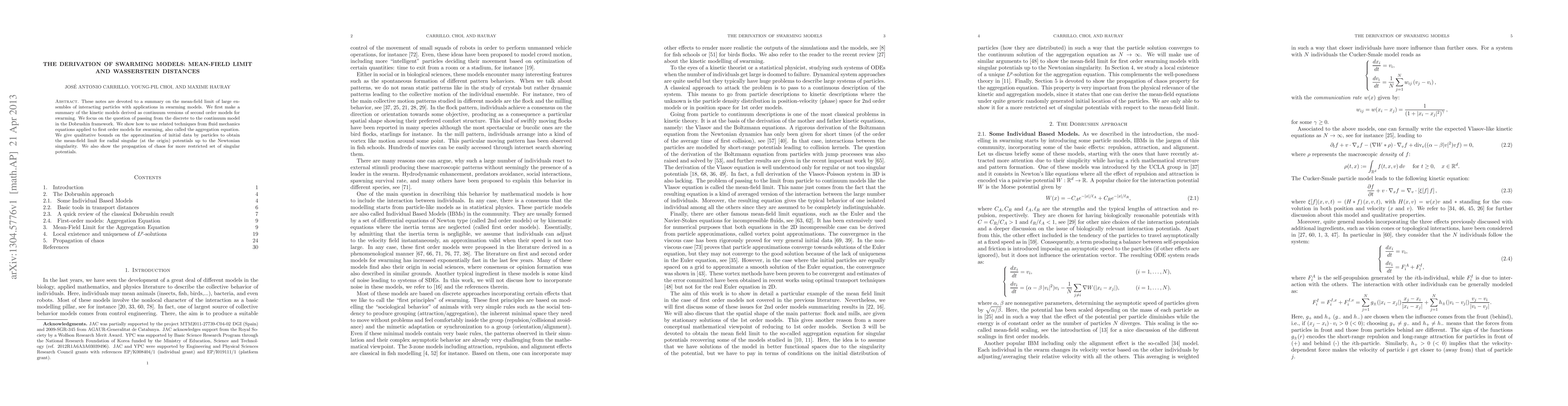 This paper explores how to derive swarming models using mean-field limit and Wasserstein distances from discrete particle systems. It aims to create continuum versions of second-order models for swarming, providing bounds on the approximation of initial data by particles.
