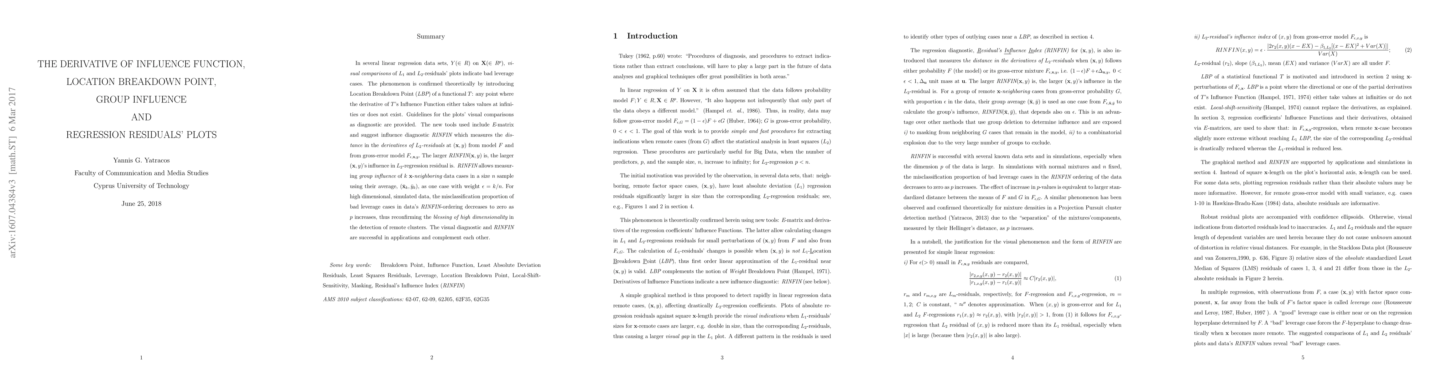 In several linear regression data sets, $Y (\in R)$ on ${\bf X} (\in R^p),$ visual comparisons of $L_1$ and $L_2$-residuals' plots indicate bad leverage cases. The phenomenon is confirmed theoretically by introducing Location Breakdown Point (LBP) of a functional $T$: any point where the derivative of $T$'s Influence Function either takes values at infinities or does not exist. Guidelines for the plots' visual comparisons as diagnostic are provided. The new tools used include E-matrix and suggest influence diagnostic RINFIN which measures the distance in the derivatives of $L_2$-residuals} at $({\bf x},y)$ from model $F$ and from gross-error model $F_{\epsilon, {\bf x},y}.$ The larger RINFIN$({\bf x},y)$ is, the larger $({\bf x},y)$'s influence in $L_2$-regression residual is. RINFIN allows measuring group influence of $k$ ${\bf x}$-neighboring data cases in a size $n$ sample using their average, $(\bar {\bf x}_k,\bar y_k),$ as one case with weight $\epsilon=k/n.$ For high dimensional, simulated data, the misclassification proportion of bad leverage cases in data's RINFIN-ordering decreases to zero as $p$ increases, thus reconfirming the blessing of high dimensionality in the detection of remote clusters. The visual diagnostic and RINFIN are successful in applications and complement each other.
