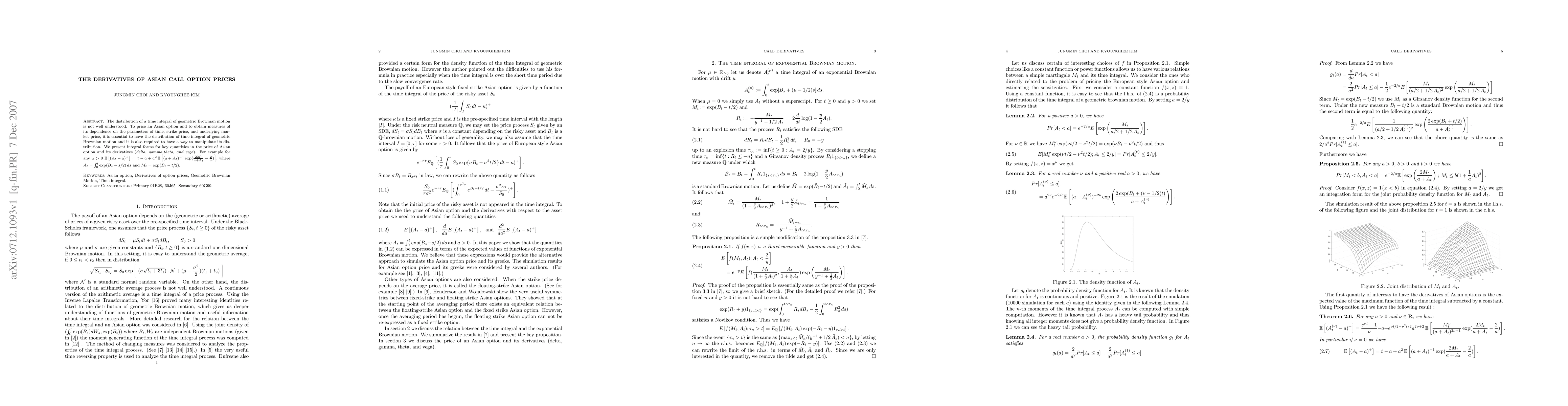 This paper explores the pricing of Asian call options by deriving integral forms for their key derivatives (delta, gamma, theta, and vega). It addresses the complex distribution of the time integral of geometric Brownian motion, providing a method to manipulate this distribution for better option pricing.
