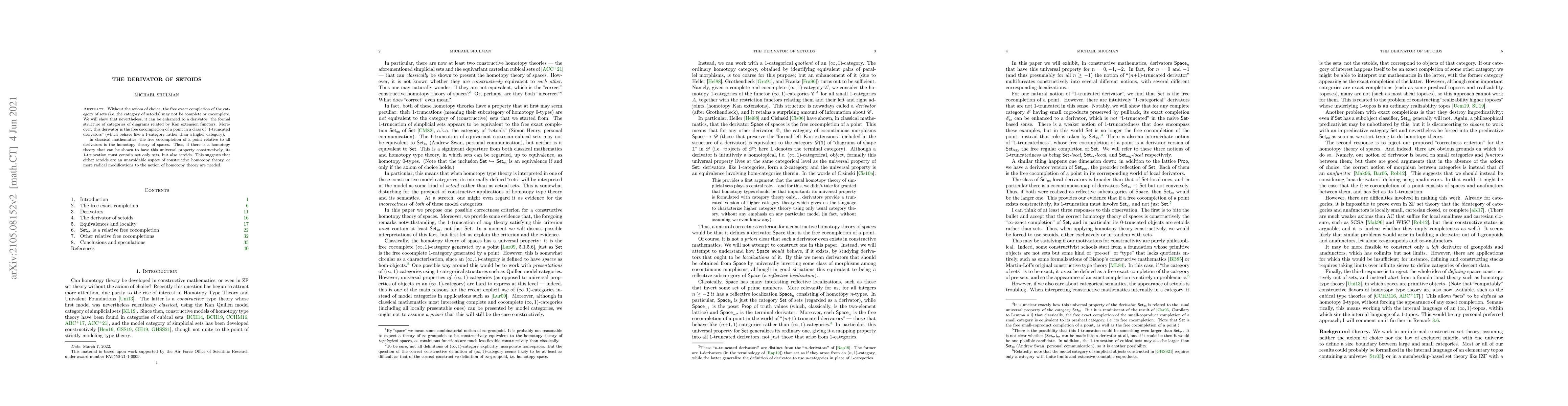 Without the axiom of choice, the free exact completion of the category of sets (i.e. the category of setoids) may not be complete or cocomplete. We will show that nevertheless, it can be enhanced to a derivator: the formal structure of categories of diagrams related by Kan extension functors. Moreover, this derivator is the free cocompletion of a point in a class of "1-truncated derivators" (which behave like a 1-category rather than a higher category). In classical mathematics, the free cocompletion of a point relative to all derivators is the homotopy theory of spaces. Thus, if there is a homotopy theory that can be shown to have this universal property constructively, its 1-truncation must contain not only sets, but also setoids. This suggests that either setoids are an unavoidable aspect of constructive homotopy theory, or more radical modifications to the notion of homotopy theory are needed.