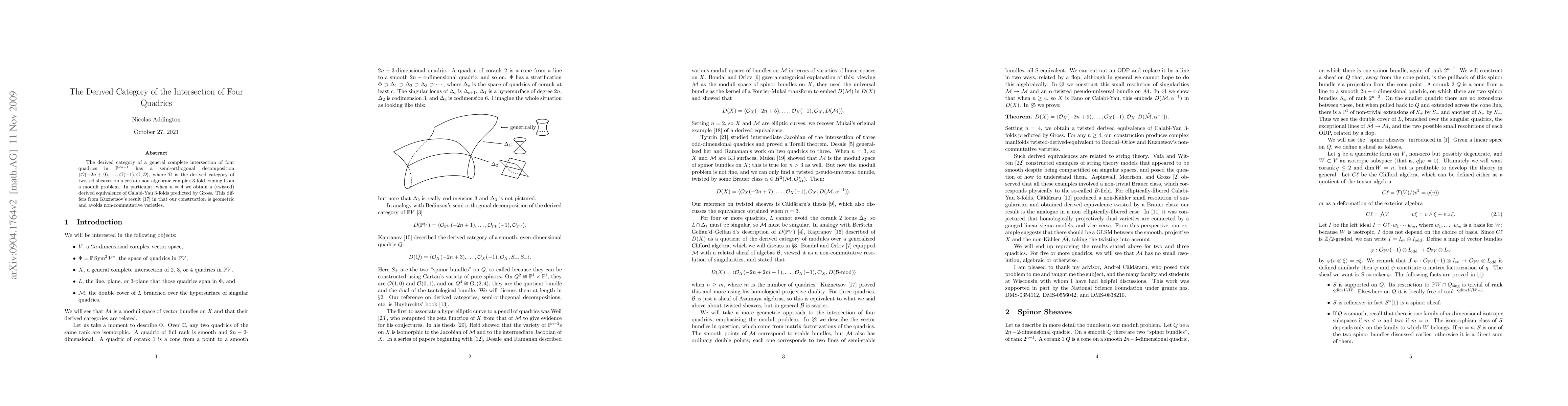 This paper explores the derived category of a complete intersection formed by four quadrics in projective space, revealing a semi-orthogonal decomposition involving specific line bundles. It establishes a (twisted) derived equivalence for Calabi-Yau 3-folds, differing from Kuznetsov's approach by using geometric methods and avoiding non-commutative varieties.