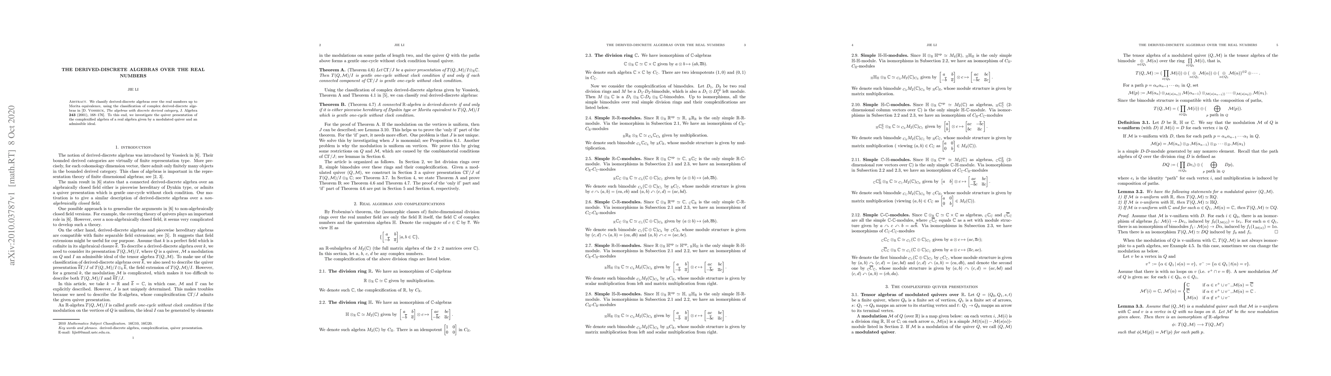 We classify derived-discrete algebras over the real numbers up to Morita equivalence, using the classification of complex derived-discrete algebras in [{\sc D. Vossieck}, {\em The algebras with discrete derived category}, J. Algebra {\bf 243} (2001), 168--176]. To this end, we investigate the quiver presentation of the complexified algebra of a real algebra given by a modulated quiver and an admissible ideal.