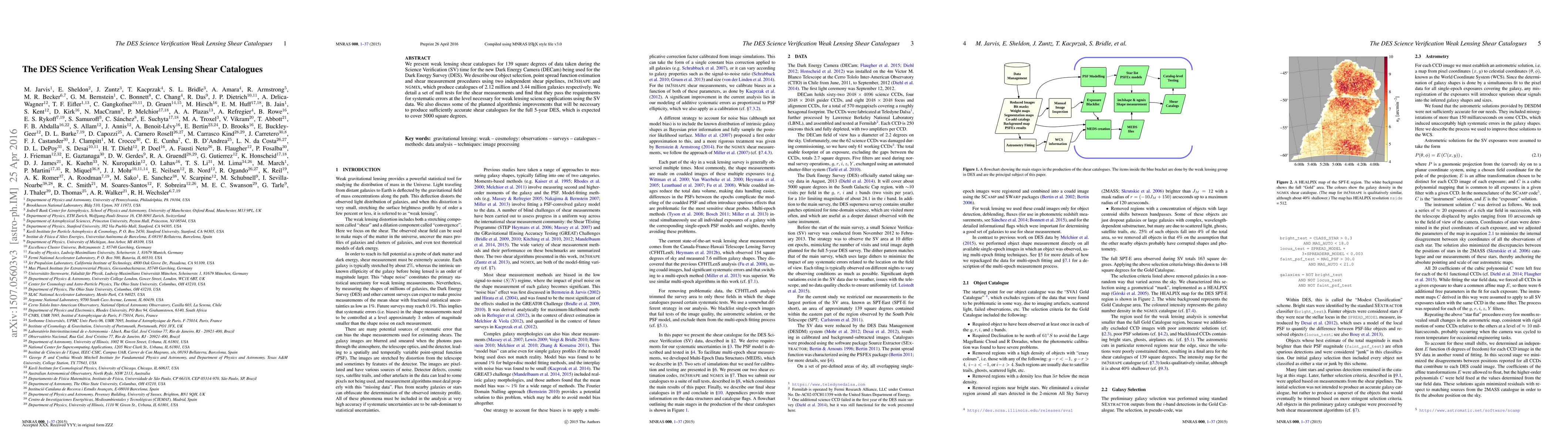This paper presents weak lensing shear catalogues from Science Verification data for the Dark Energy Camera (DECam) used in the Dark Energy Survey (DES), detailing object selection and shear measurement procedures using two pipelines. The results pass systematic error tests suitable for weak lensing science, with plans for algorithmic improvements for the full survey.