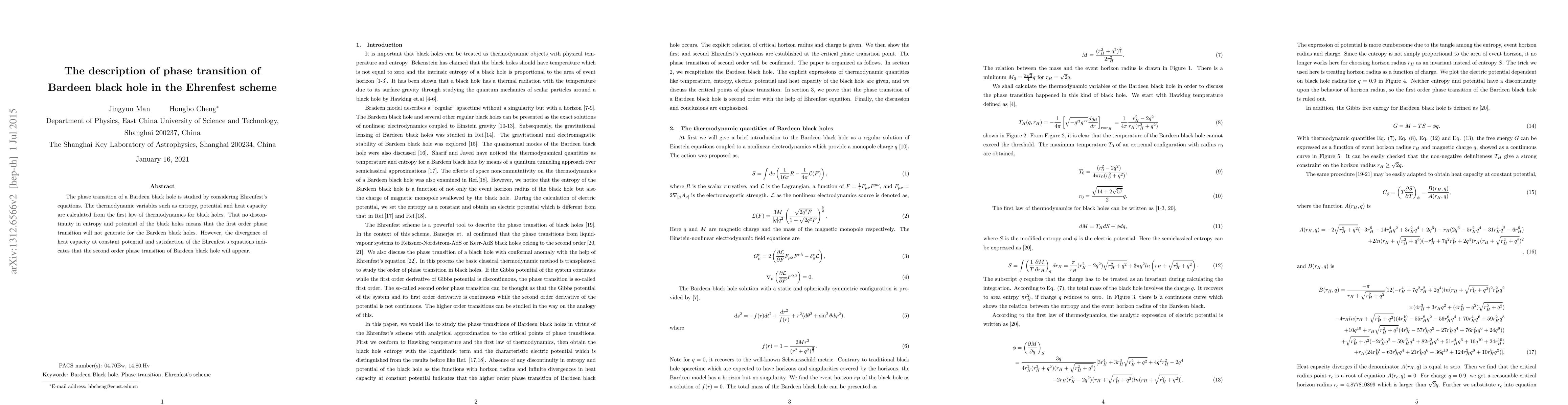 This paper investigates the phase transition of Bardeen black holes using Ehrenfest's equations, finding no first-order phase transition due to continuous thermodynamic variables. It concludes that a second-order phase transition occurs, evidenced by the divergence of heat capacity and adherence to Ehrenfest's equations.
