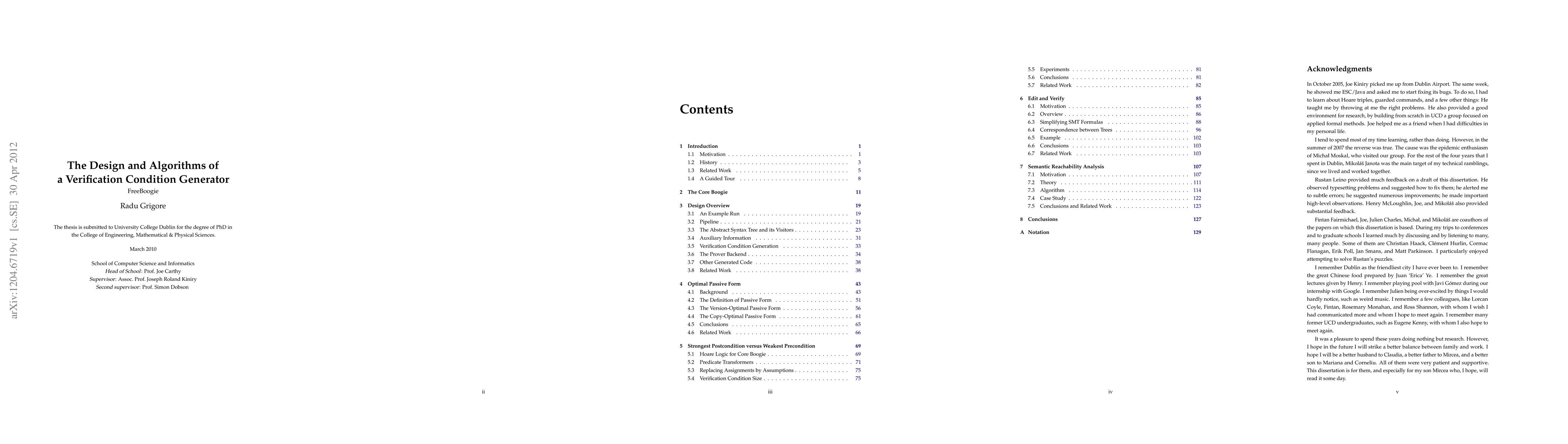 This dissertation explores various problems related to verification condition generators, including a new language called Boogie and techniques for formalizing transformation complexities, incremental verification, and unreachable code detection.