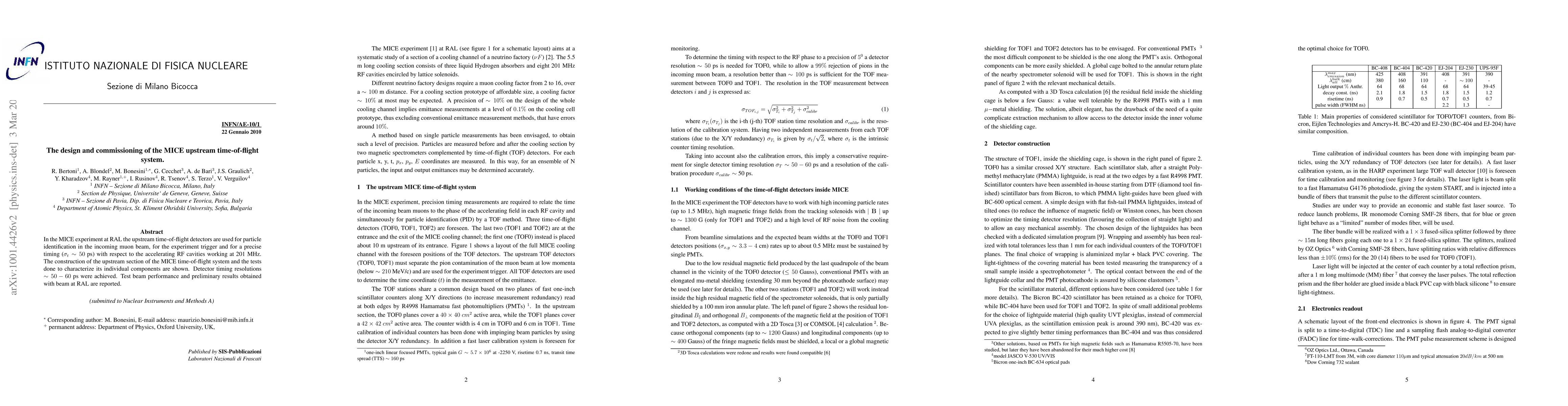 The MICE experiment at RAL deployed an upstream time-of-flight system for particle identification and precise timing, achieving timing resolutions of ~50-60 ps. Detailed construction and commissioning of the system, along with test beam results, are reported.