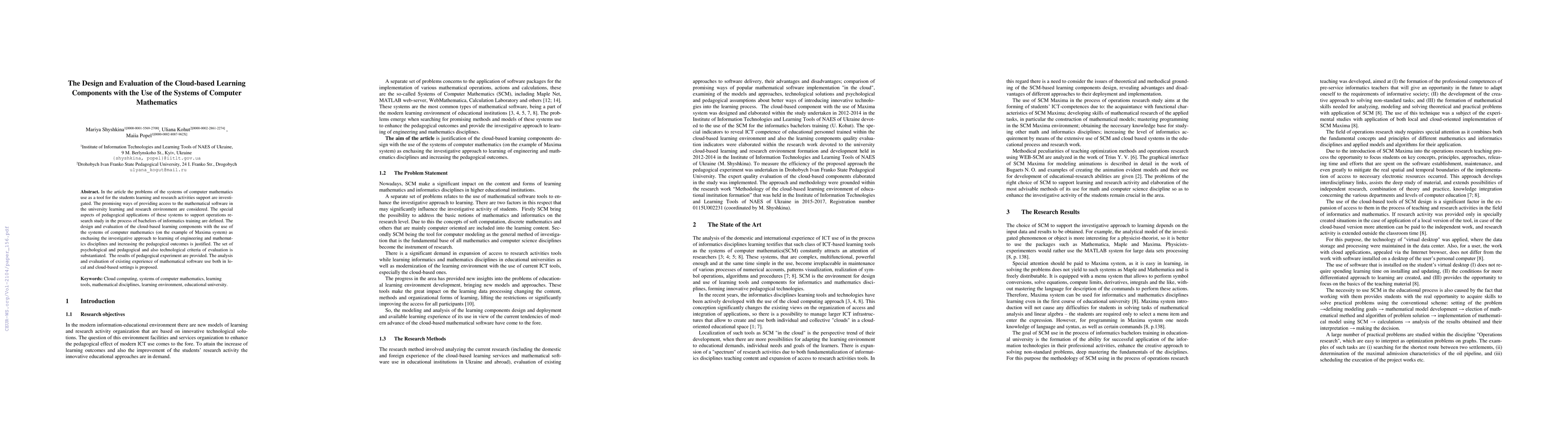 In the article the problems of the systems of computer mathematics use as a tool for the students learning and research activities support are investigated. The promising ways of providing access to the mathematical software in the university learning and research environment are considered. The special aspects of pedagogical applications of these systems to support operations research study in the process of bachelors of informatics training are defined. The design and evaluation of the cloud-based learning components with the use of the systems of computer mathematics (on the example of Maxima system) as enchasing the investigative approach to learning of engineering and mathematics disciplines and increasing the pedagogical outcomes is justified. The set of psychological and pedagogical and also technological criteria of evaluation is substantiated. The results of pedagogical experiment are provided. The analysis and evaluation of existing experience of mathematical software use both in local and cloud-based settings is proposed.