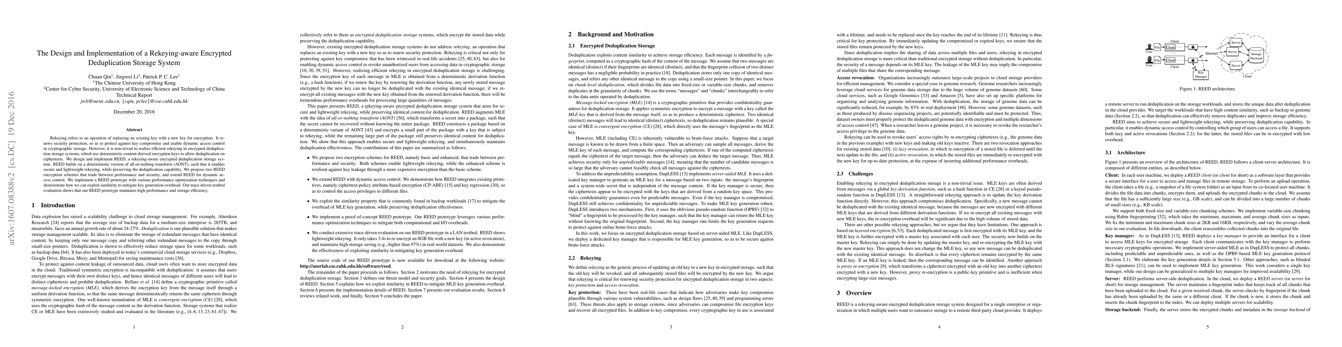 The paper designs and implements REED, a rekeying-aware encrypted deduplication storage system that employs a deterministic version of the all-or-nothing transform for secure and efficient rekeying while maintaining deduplication capability. The authors propose two encryption schemes and implement a prototype, demonstrating high performance and storage efficiency.