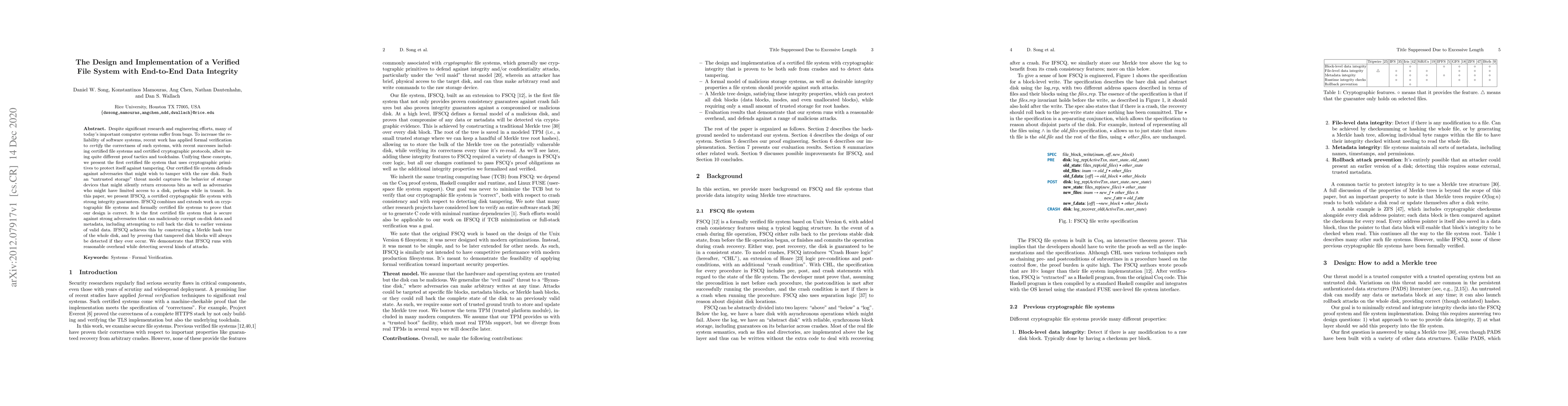 This paper presents IFSCQ, a certified cryptographic file system that ensures data integrity against tampering by constructing a Merkle hash tree and detecting corrupted disk blocks. It combines formal verification and cryptographic techniques to provide strong security guarantees against adversaries attempting to corrupt on-disk data.
