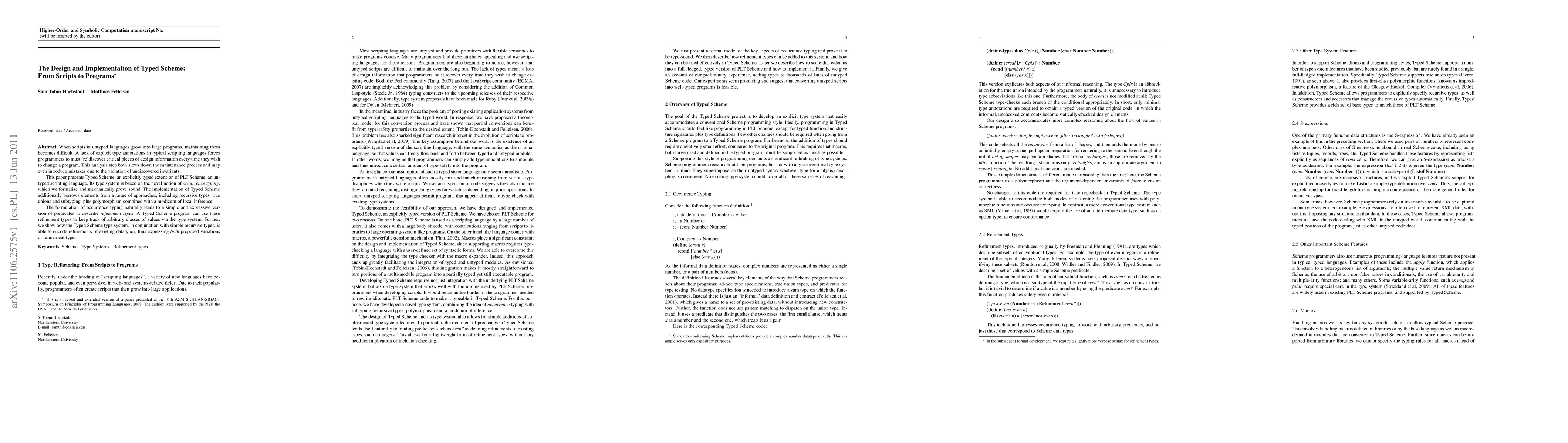 When scripts in untyped languages grow into large programs, maintaining them becomes difficult. A lack of explicit type annotations in typical scripting languages forces programmers to must (re)discover critical pieces of design information every time they wish to change a program. This analysis step both slows down the maintenance process and may even introduce mistakes due to the violation of undiscovered invariants. This paper presents Typed Scheme, an explicitly typed extension of PLT Scheme, an untyped scripting language. Its type system is based on the novel notion of occurrence typing, which we formalize and mechanically prove sound. The implementation of Typed Scheme additionally borrows elements from a range of approaches, including recursive types, true unions and subtyping, plus polymorphism combined with a modicum of local inference. The formulation of occurrence typing naturally leads to a simple and expressive version of predicates to describe refinement types. A Typed Scheme program can use these refinement types to keep track of arbitrary classes of values via the type system. Further, we show how the Typed Scheme type system, in conjunction with simple recursive types, is able to encode refinements of existing datatypes, thus expressing both proposed variations of refinement types.