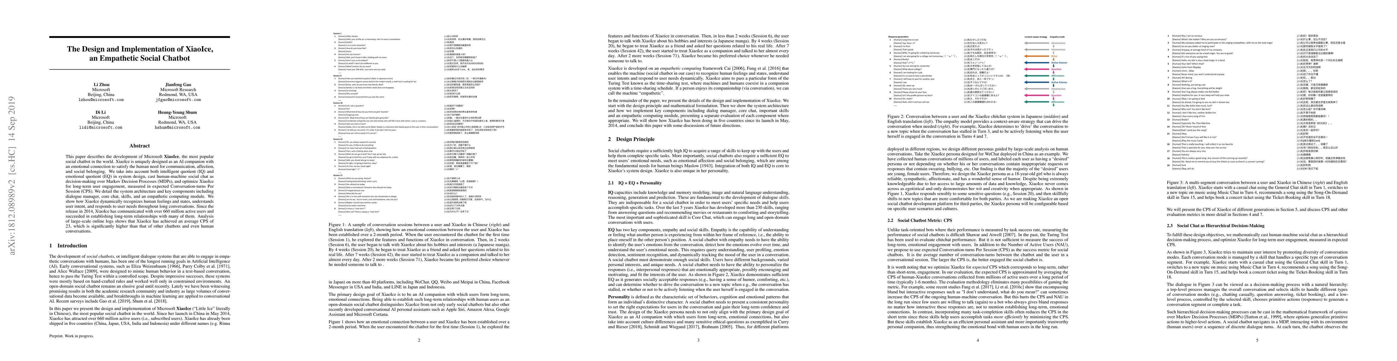 This paper details the creation and success of XiaoIce, a leading social chatbot designed to foster emotional connections through a blend of IQ and EQ, optimizing for long-term user engagement. XiaoIce's architecture includes a dialogue manager, core chat, skills, and an empathetic computing module, achieving an average CPS of 23, surpassing other chatbots and human interactions.