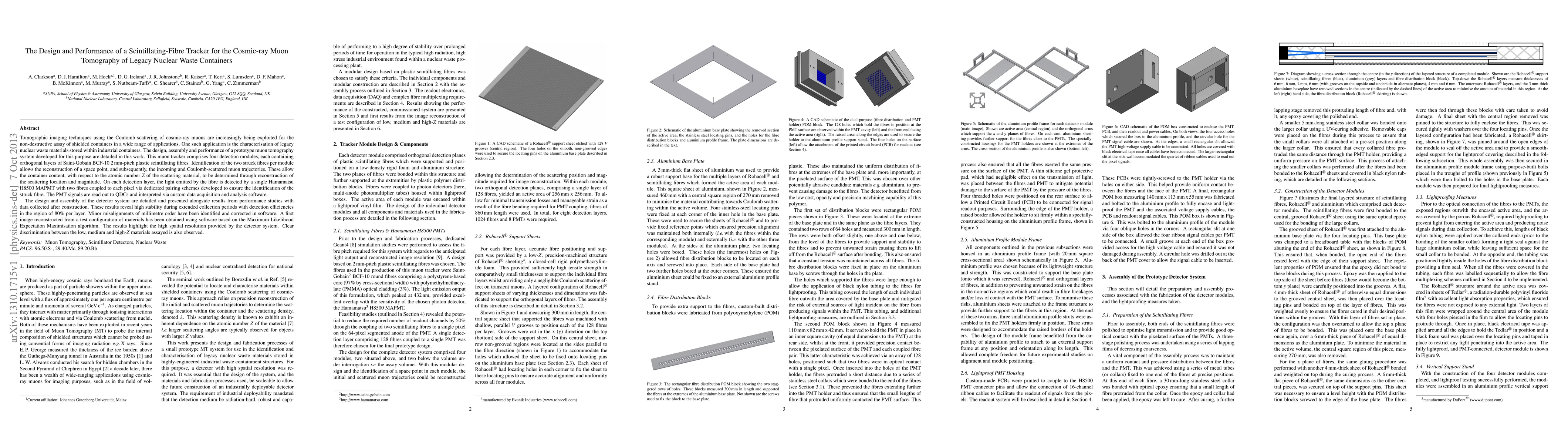 Tomographic imaging techniques using the Coulomb scattering of cosmic-ray muons are increasingly being exploited for the non-destructive assay of shielded containers in a wide range of applications. One such application is the characterisation of legacy nuclear waste materials stored within industrial containers. The design, assembly and performance of a prototype muon tomography system developed for this purpose are detailed in this work. This muon tracker comprises four detection modules, each containing orthogonal layers of Saint-Gobain BCF-10 2mm-pitch plastic scintillating fibres. Identification of the two struck fibres per module allows the reconstruction of the incoming and Coulomb-scattered muon trajectories. These allow the container content, with respect to the atomic number Z of the scattering material, to be determined through reconstruction of the scattering location and magnitude. On each detection layer, the light emitted by the fibre is detected by a single Hamamatsu H8500 MAPMT with two fibres coupled to each pixel via dedicated pairing schemes developed to ensure the identification of the struck fibre. The PMT signals are read out to QDCs. The design and assembly of the detector system are detailed and presented alongside results from performance studies with data collected after construction. These results reveal high stability during extended collection periods with detection efficiencies in the region of 80% per layer. Minor misalignments of millimetre order have been identified and corrected in software. A first image reconstructed from a test configuration of materials has been obtained using software based on the Maximum Likelihood Expectation Maximisation algorithm. The results highlight the high spatial resolution provided by the detector system. Clear discrimination between the low, medium and high-Z materials assayed is also observed.
