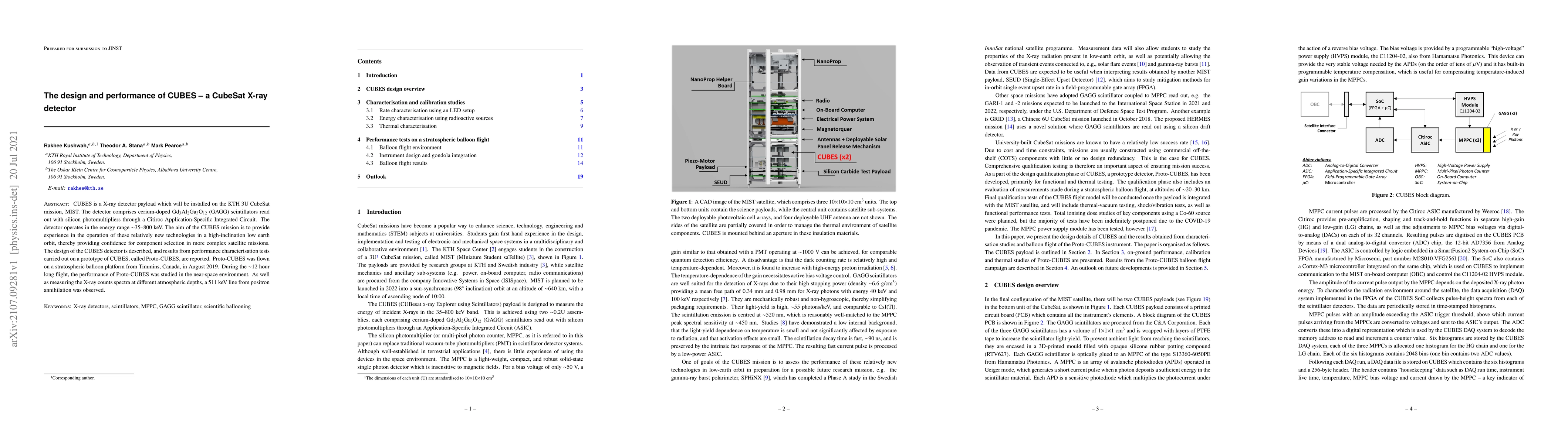 CUBES is a X-ray detector payload which will be installed on the KTH 3U CubeSat mission, MIST. The detector comprises cerium-doped Gd3Al2Ga3O12 (GAGG) scintillators read out with silicon photomultipliers through a Citiroc Application-Specific Integrated Circuit. The detector operates in the energy range $\sim$35-800 keV. The aim of the CUBES mission is to provide experience in the operation of these relatively new technologies in a high-inclination low earth orbit, thereby providing confidence for component selection in more complex satellite missions. The design of the CUBES detector is described, and results from performance characterisation tests carried out on a prototype of CUBES, called Proto-CUBES, are reported. Proto-CUBES was flown on a stratospheric balloon platform from Timmins, Canada, in August 2019. During the $\sim$12 hour long flight, the performance of Proto-CUBES was studied in the near-space environment. As well as measuring the X-ray counts spectra at different atmospheric depths, a 511 keV line from positron annihilation was observed.
