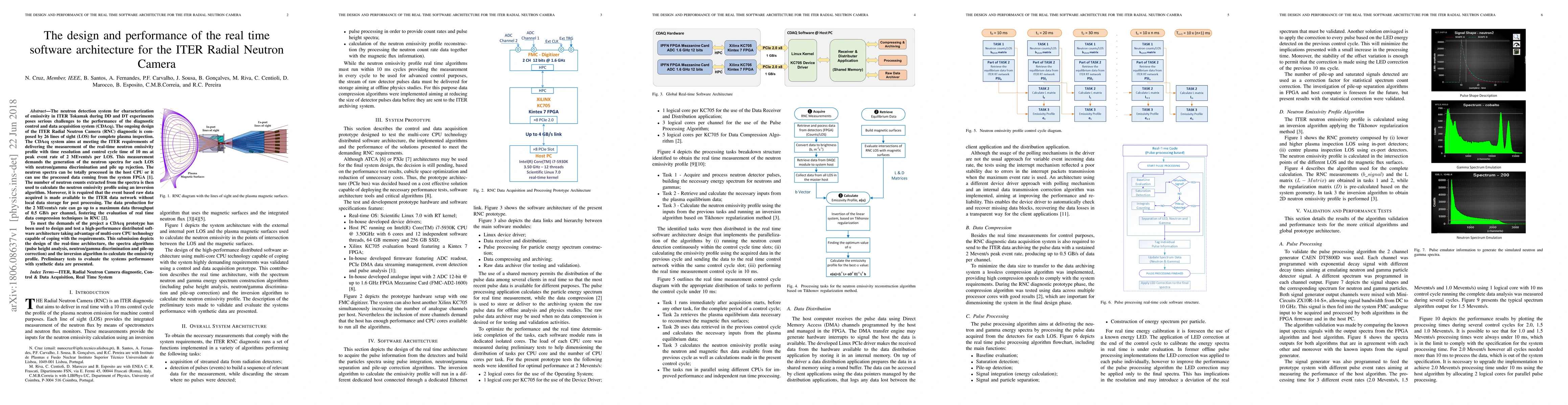 The neutron detection system for characterization of emissivity in ITER Tokamak during DD and DT experiments poses serious challenges to the performance of the diagnostic control and data acquisition system (CDAcq). The ongoing design of the ITER Radial Neutron Camera (RNC) diagnostic is composed by 26 lines of sight (LOS) for complete plasma inspection. The CDAcq system aims at meeting the ITER requirements of delivering the measurement of the real-time neutron emissivity profile with time resolution and control cycle time of 10 ms at peak event rate of 2 MEvents/s per LOS. This measurement demands the generation of the neutron spectra for each LOS with neutron/gamma discrimination and pile up rejection. The neutron spectra can be totally processed in the host CPU or it can use the processed data coming from the system FPGA. The number of neutron counts extracted from the spectra is then used to calculate the neutron emissivity profile using an inversion algorithm. Moreover, it is required that the event based raw data acquired is made available to the ITER data network without local data storage for post processing. The data production for the 2 MEvents/s rate can go up to a maximum data throughput of 0.5 GB/s per channel. The evaluation of the use of real-time data compression techniques in RNC is also depicted in another contribution. To meet the demands of the project a CDAcq prototype has been used to design and test a high-performance distributed software architecture taking advantage of multi-core CPU technology capable of coping with the requirements. This submission depicts the design of the real-time architecture, the spectra algorithms (pulse height analysis, neutron/gamma discrimination and pile-up correction) and the inversion algorithm to calculate the emissivity profile. Preliminary tests to evaluate the system performance with synthetic data are presented.