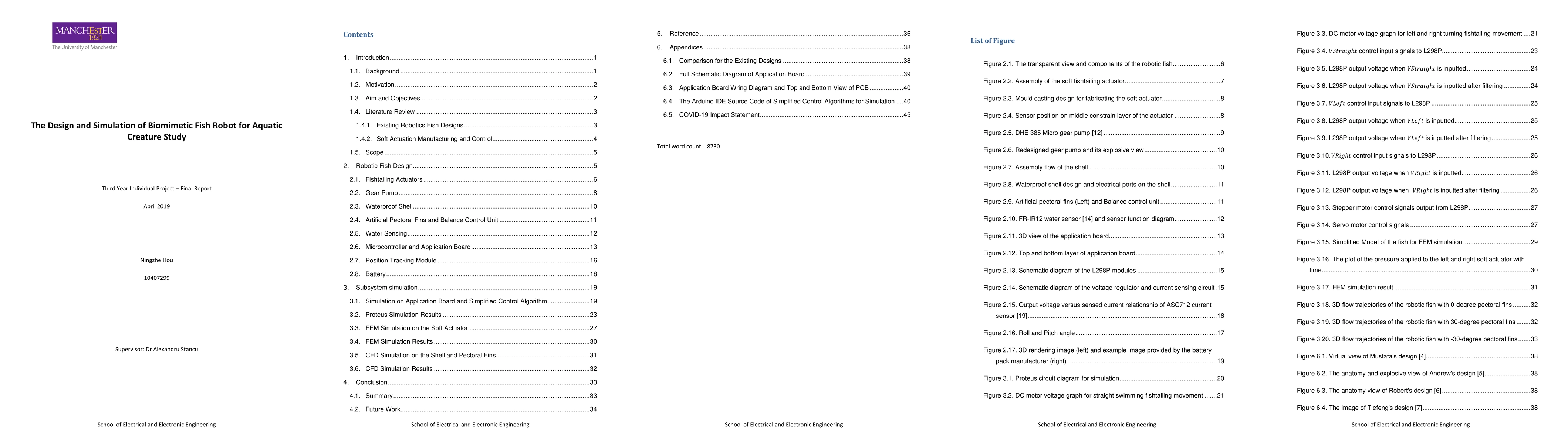 In the application of underwater creature study, comparing with propeller-powered ROVs and servo motor actuated robotic fish, novel biomimetic fish robot designs with soft actuation structure could interact with aquatic creatures closely and record authentic habitats and behaviours. This final project report presents the detailed design process of a hydraulic soft actuator powered robotic fish for aquatic creature study capable of swimming along the 3D trajectory. The robotic fish is designed based on the analysis of the pro and cons of existing designs. Except for the mechanical and electronic designs and manufacturing method of crucial components, a simplified open-loop control algorithm was designed to check the functionality of the application board and microcontroller in the Proteus simulation environment. As the key component of the robotic fish, Finite Element Method (FEM) simulations were conducted to visualise the soft actuator's deformation under different pressure to validate the design. Computational Fluid Dynamics (CFD) simulations were also conducted to improve the hydrodynamic efficiency of the shape of robotic fish. Although physical manufacturing is impossible due to the pandemic, the simulations show overall good performance in terms of control, actuation, and hydrodynamic efficiency.