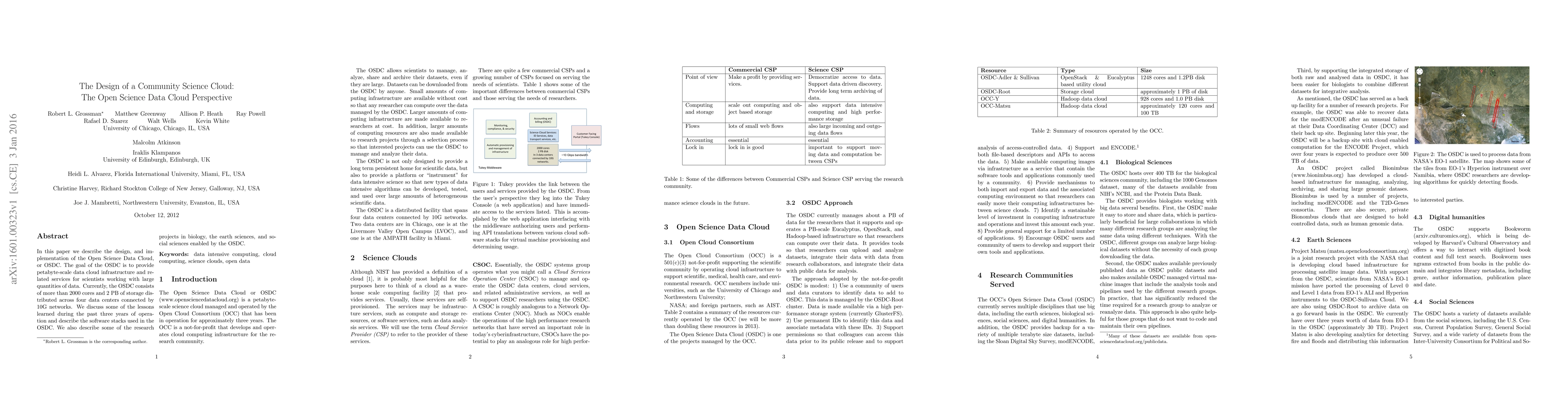 In this paper we describe the design, and implementation of the Open Science Data Cloud, or OSDC. The goal of the OSDC is to provide petabyte-scale data cloud infrastructure and related services for scientists working with large quantities of data. Currently, the OSDC consists of more than 2000 cores and 2 PB of storage distributed across four data centers connected by 10G networks. We discuss some of the lessons learned during the past three years of operation and describe the software stacks used in the OSDC. We also describe some of the research projects in biology, the earth sciences, and social sciences enabled by the OSDC.