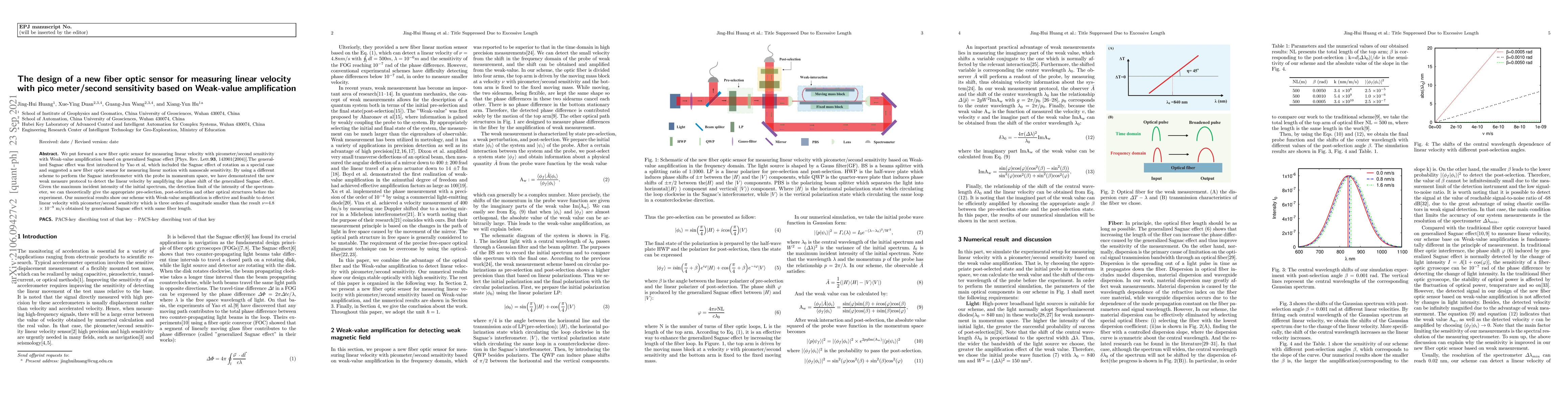 This paper proposes a novel fiber optic sensor utilizing Weak-value amplification based on the generalized Sagnac effect to measure linear velocity with pico meter/second sensitivity. The new scheme demonstrates significant improvement in detection sensitivity, achieving three orders of magnitude better than previous methods.