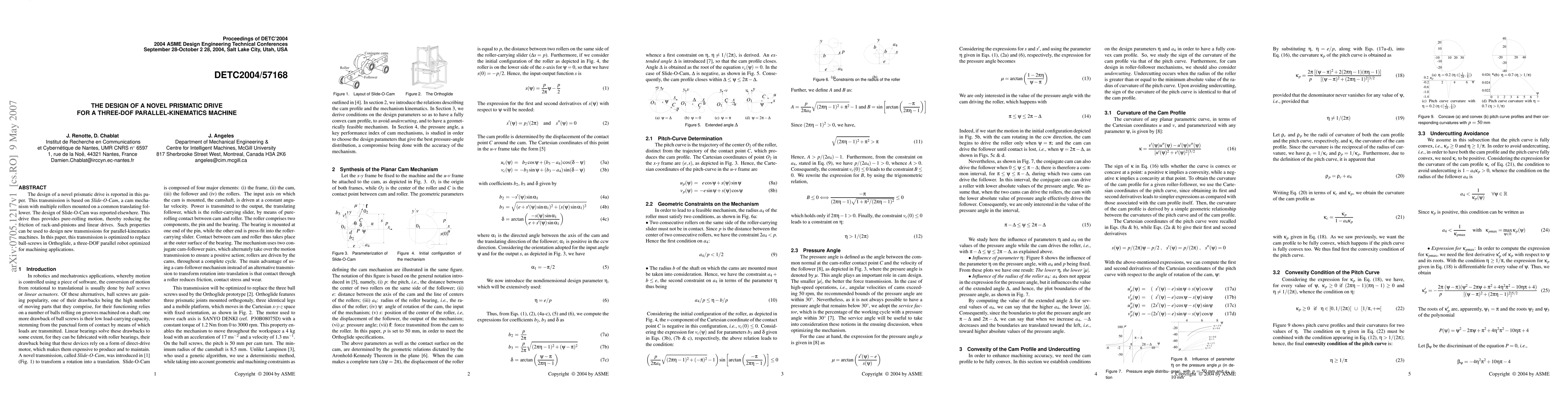 The design of a novel prismatic drive is reported in this paper. This transmission is based on Slide-O-Cam, a cam mechanism with multiple rollers mounted on a common translating follower. The design of Slide-O-Cam was reported elsewhere. This drive thus provides pure-rolling motion, thereby reducing the friction of rack-and-pinions and linear drives. Such properties can be used to design new transmissions for parallel-kinematics machines. In this paper, this transmission is optimized to replace ball-screws in Orthoglide, a three-DOF parallel robot optimized for machining applications.