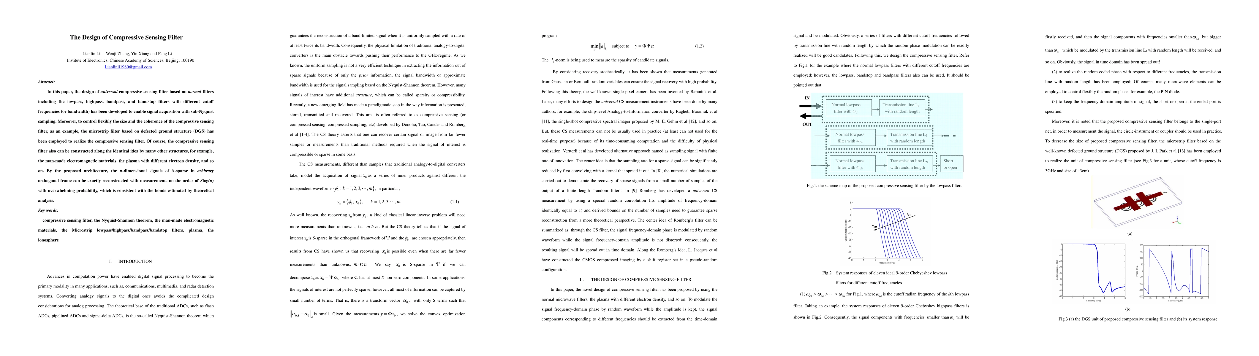 Researchers designed a universal compressive sensing filter to acquire signals with sub-Nyquist sampling, enabling reconstruction of sparse signals from limited measurements. The filter's size and coherence can be controlled using various structures, including microstrip filters.