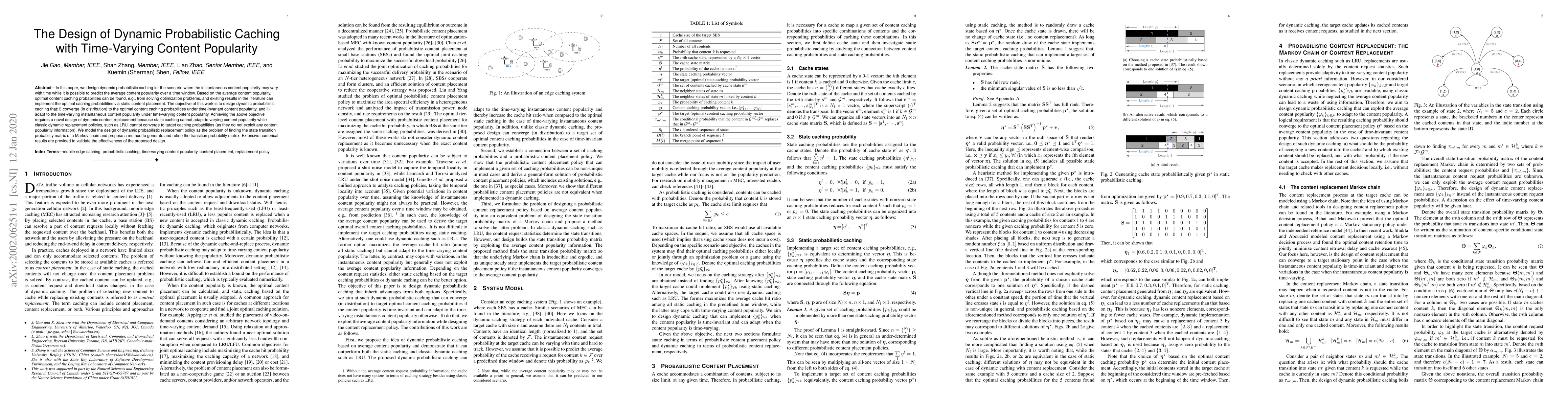 This paper designs dynamic probabilistic caching to handle time-varying content popularity, proposing a novel dynamic replacement policy that converges to optimal caching probabilities and adapts to changes. The method involves refining a state transition probability matrix for a Markov chain, validated by extensive numerical results.