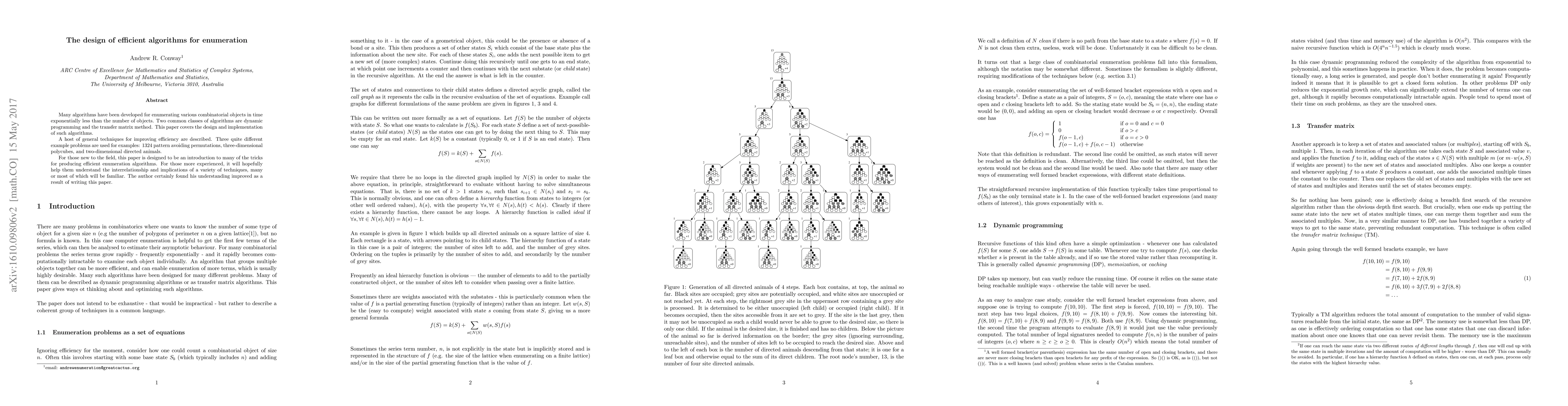 This paper explores the efficient design and implementation of algorithms for enumerating combinatorial objects, focusing on dynamic programming and the transfer matrix method. It introduces general techniques for improving efficiency and uses examples like 1324 pattern avoiding permutations to illustrate these methods.