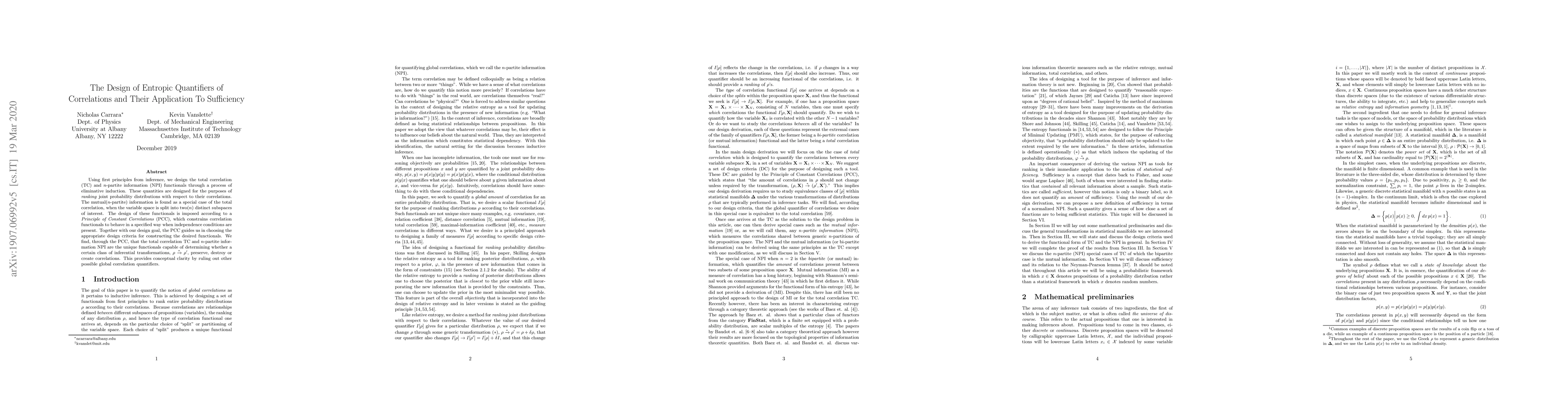 Using first principles from inference, we design a set of functionals for the purposes of \textit{ranking} joint probability distributions with respect to their correlations. Starting with a general functional, we impose its desired behaviour through the \textit{Principle of Constant Correlations} (PCC), which constrains the correlation functional to behave in a consistent way under statistically independent inferential transformations. The PCC guides us in choosing the appropriate design criteria for constructing the desired functionals. Since the derivations depend on a choice of partitioning the variable space into $n$ disjoint subspaces, the general functional we design is the $n$-partite information (NPI), of which the \textit{total correlation} and \textit{mutual information} are special cases. Thus, these functionals are found to be uniquely capable of determining whether a certain class of inferential transformations, $\rho\xrightarrow{*}\rho'$, preserve, destroy or create correlations. This provides conceptual clarity by ruling out other possible global correlation quantifiers. Finally, the derivation and results allow us to quantify non-binary notions of statistical sufficency. Our results express what percentage of the correlations are preserved under a given inferential transformation or variable mapping.