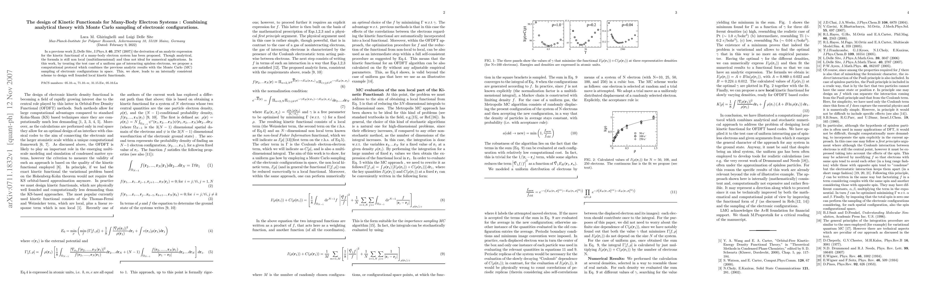 In a previous work [L.Delle Site, J.Phys.A 40, 2787 (2007)] the derivation of an analytic expression for the kinetic functional of a many-body electron system has been proposed. Though analytical, the formula is still non local (multidimensional) and thus not ideal for numerical applications. In this work, by treating the test case of a uniform gas of interacting spinless electrons, we propose a computational protocol which combines the previous analytic results with the Monte Carlo (MC) sampling of electronic configurations in space. This, we show, leads to an internally consistent scheme to design well founded local kinetic functionals.