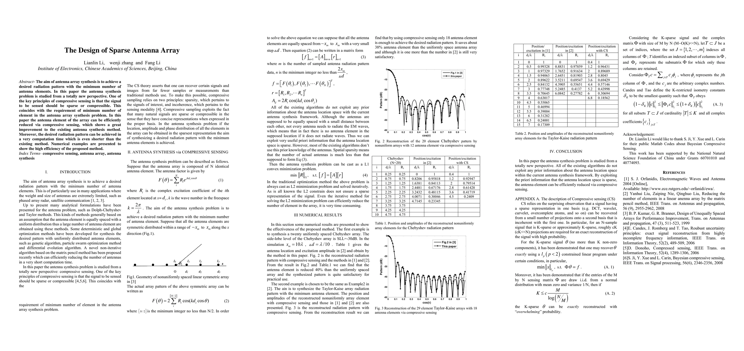 This paper proposes a novel method for synthesizing sparse antenna arrays using compressive sensing, achieving desired radiation patterns with fewer elements and significantly reduced computational time compared to existing methods. Numerical examples demonstrate the efficiency and effectiveness of the proposed approach.