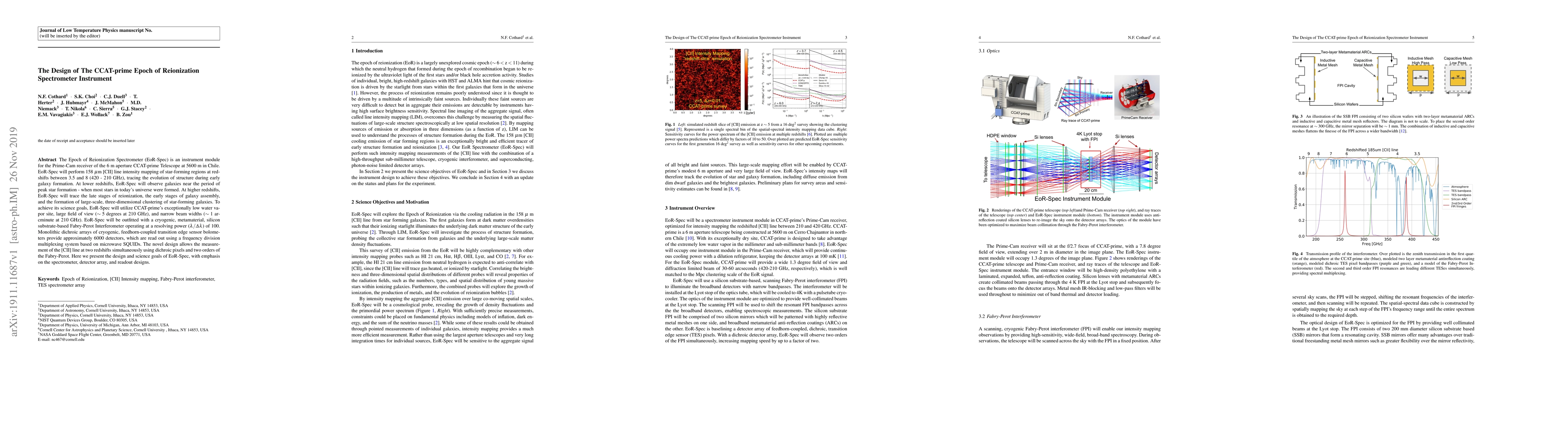 The CCAT-prime Epoch of Reionization Spectrometer (EoR-Spec) is designed to map the [CII] line at 158 μm to study early galaxy formation and reionization. It features a cryogenic Fabry-Perot interferometer and a large array of bolometers to achieve high resolution and sensitivity.