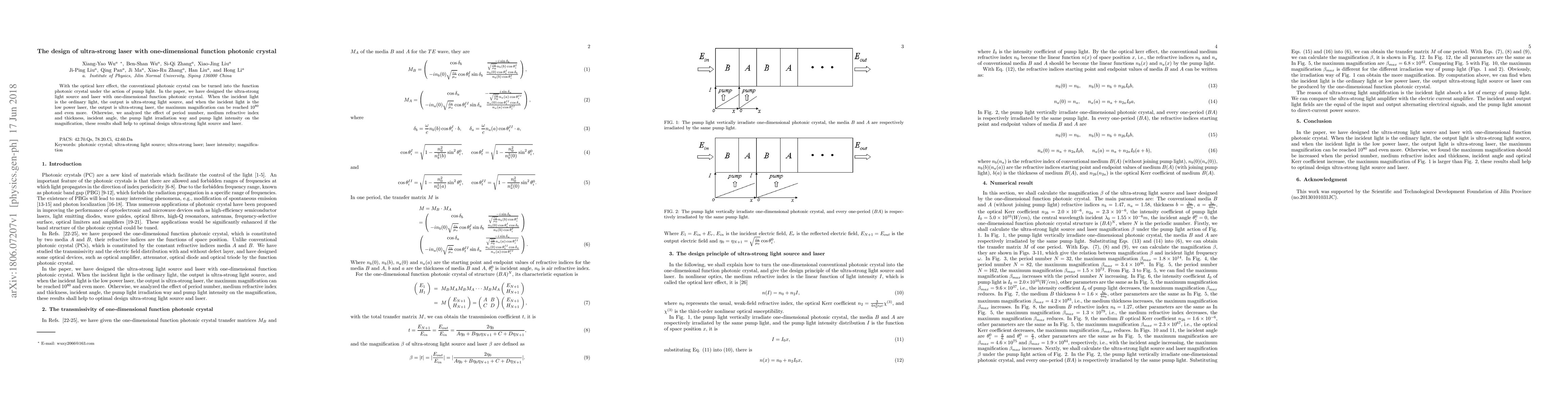 This paper designs an ultra-strong laser utilizing a one-dimensional function photonic crystal, achieving magnifications up to $10^{80}$ or more. The study also analyzes various factors affecting the laser's performance to optimize its design.