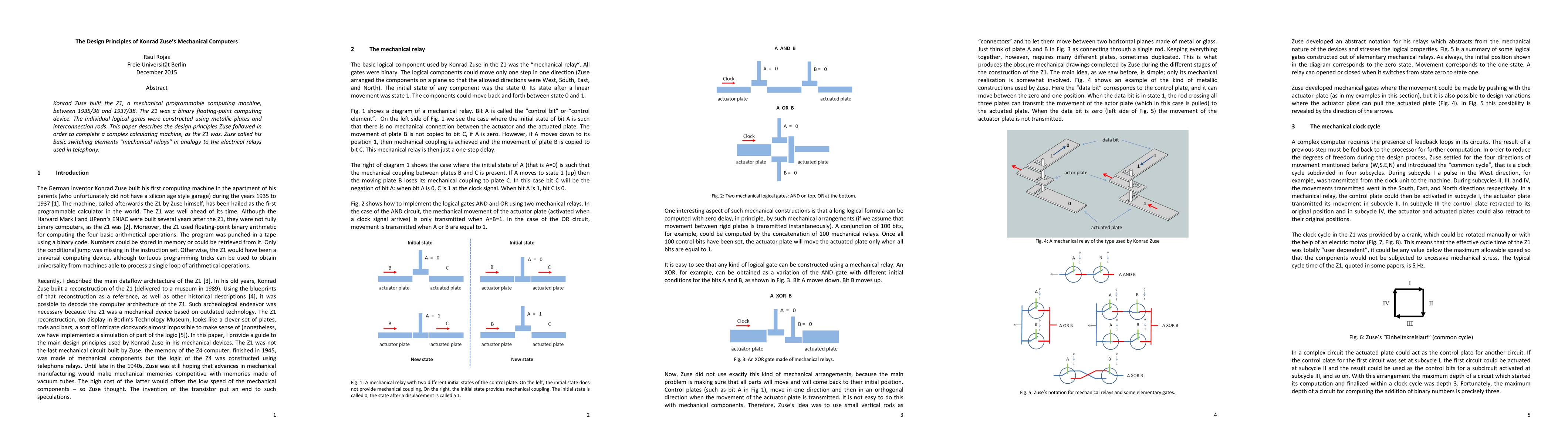 Konrad Zuse built the Z1, a mechanical programmable computing machine, between 1935/36 and 1937/38. The Z1 was a binary floating-point computing device. The individual logical gates were constructed using metallic plates and interconnection rods. This paper describes the design principles Zuse followed in order to complete a complex calculating machine, as the Z1 was. Zuse called his basic switching elements "mechanical relays" in analogy to the electrical relays used in telephony.