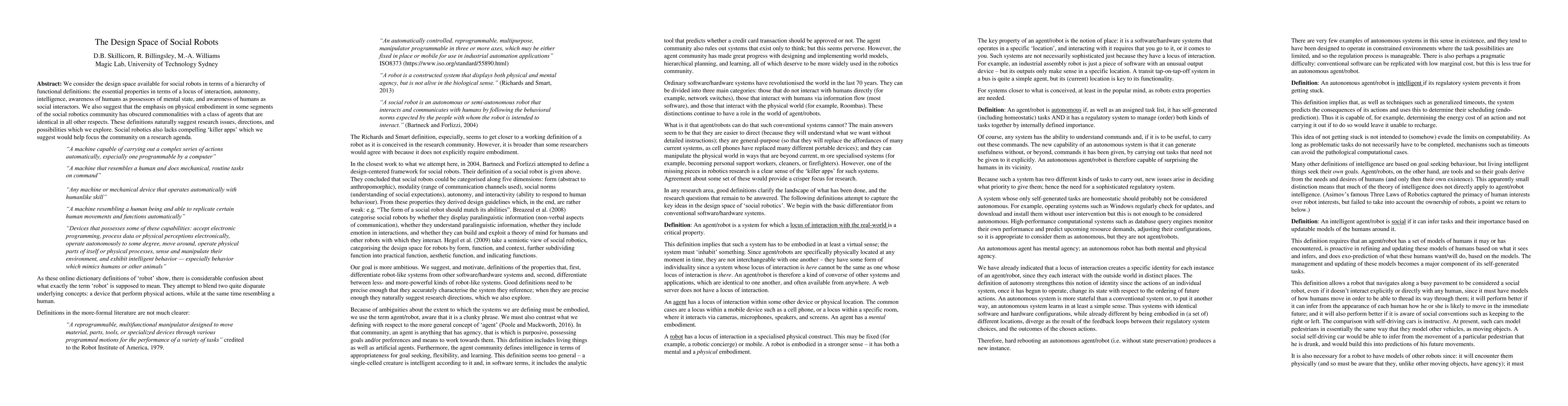 This paper explores the design space for social robots, focusing on their functional properties, including interaction locus, autonomy, intelligence, and awareness of human mental states. It critiques the overemphasis on physical embodiment and suggests that a lack of compelling applications hinders focused research in the field.
