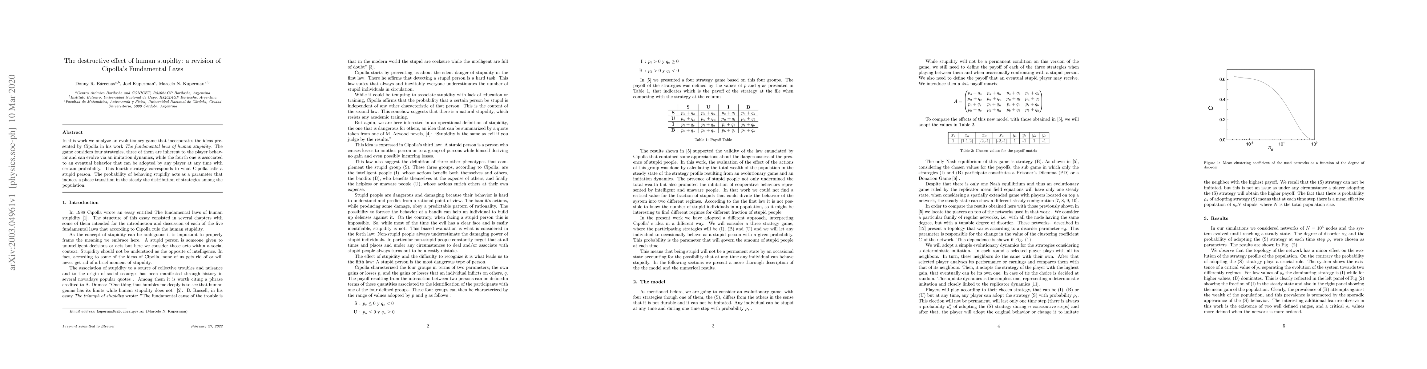 In this work we analyze an evolutionary game that incorporates the ideas presented by Cipolla in his work \textit{The fundamental laws of human stupidity}. The game considers four strategies, three of them are inherent to the player behavior and can evolve via an imitation dynamics, while the fourth one is associated to an eventual behavior that can be adopted by any player at any time with certain probability. This fourth strategy corresponds to what Cipolla calls a stupid person. The probability of behaving stupidly acts as a parameter that induces a phase transition in the steady the distribution of strategies among the population.