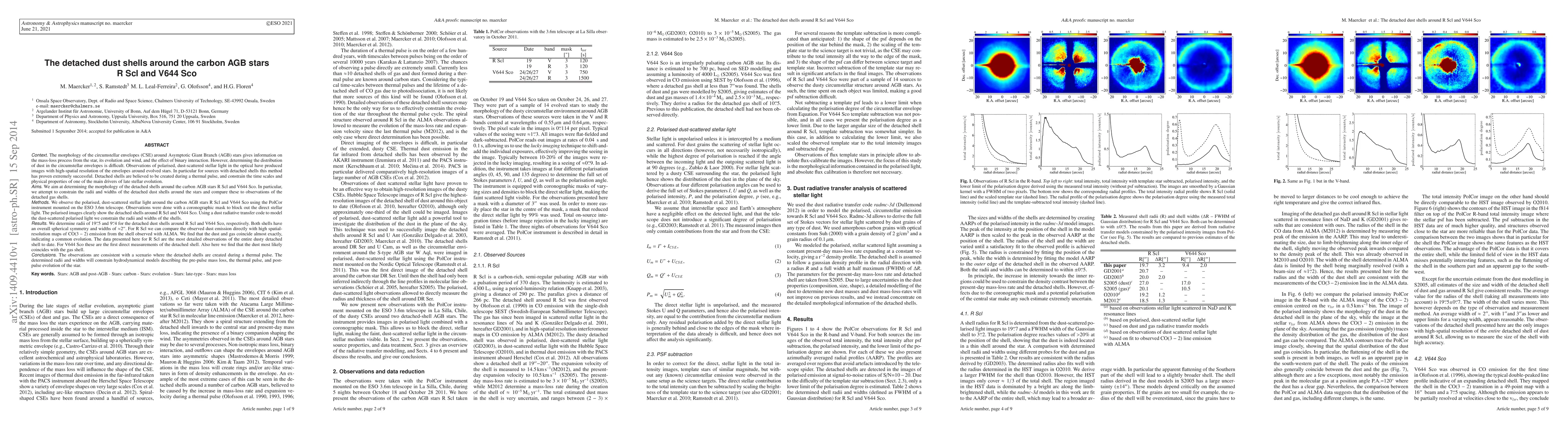 This study uses polarized light observations to determine the morphology and dimensions of detached dust shells around the carbon AGB stars R Scl and V644 Sco, finding radii of 19.5 arcsec and 9.4 arcsec respectively. The shells exhibit spherical symmetry and are consistent with formation during a thermal pulse.
