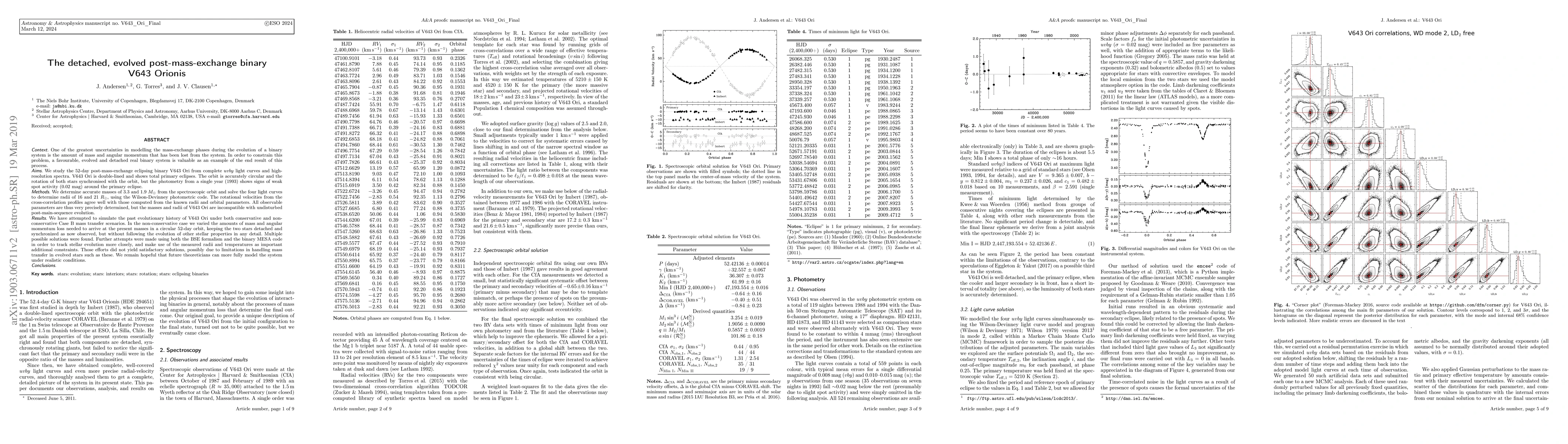 Context: One of the greatest uncertainties in modelling the mass-exchange phases during the evolution of a binary system is the amount of mass and angular momentum that has been lost from the system. To constrain this problem, a favourable, evolved and detached real binary system is valuable as an example of the end result of this process. Aims: We study the 52-day post-mass-exchange eclipsing binary V643 Ori from complete uvby light curves and high-resolution spectra. V643 Ori is a double-lined, circular orbit, synchronized binary showing total primary eclipses. Results: We determine accurate masses of 3.3 and 1.9 M(Sun) and radii of 16 and 21 R(Sun). The masses and radii are incompatible with undisturbed post-main-sequence evolution. Conclusions: We have attempted to simulate the past evolutionary history of V643 Ori under both conservative and non-conservative Case B mass transfer scenarios. In the non-conservative case we varied the amounts of mass and angular momentum loss needed to arrive at the present masses in a circular 52-day orbit, keeping the two stars detached and synchronized as now observed, but without following the evolution of other stellar properties in any detail. Multiple possible solutions were found. Further attempts were made using both the BSE formalism and the binary MESA code in order to track stellar evolution more closely, and make use of the measured radii and temperatures as important additional constraints. Those efforts did not yield satisfactory solutions, possibly due to limitations in handling mass transfer in evolved stars such as these. We remain hopeful that future theoreticians can more fully model the system under realistic conditions.