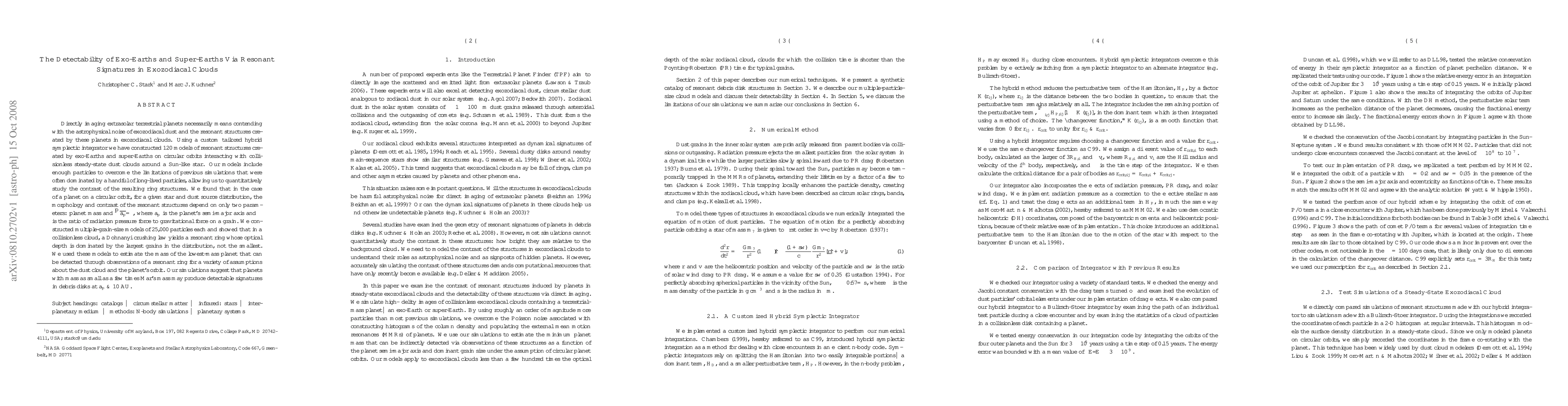 This research investigates the detectability of exo-Earths and super-Earths via resonant structures in exozodiacal dust clouds, employing a hybrid symplectic integrator to model 120 scenarios. The findings suggest that the morphology and contrast of these resonant structures depend on planet mass and a ratio involving the planet's semi-major axis and radiation pressure. The study concludes that planets as small as a few times Mars' mass may produce detectable signatures in debris disks for orbits beyond 10 AU.