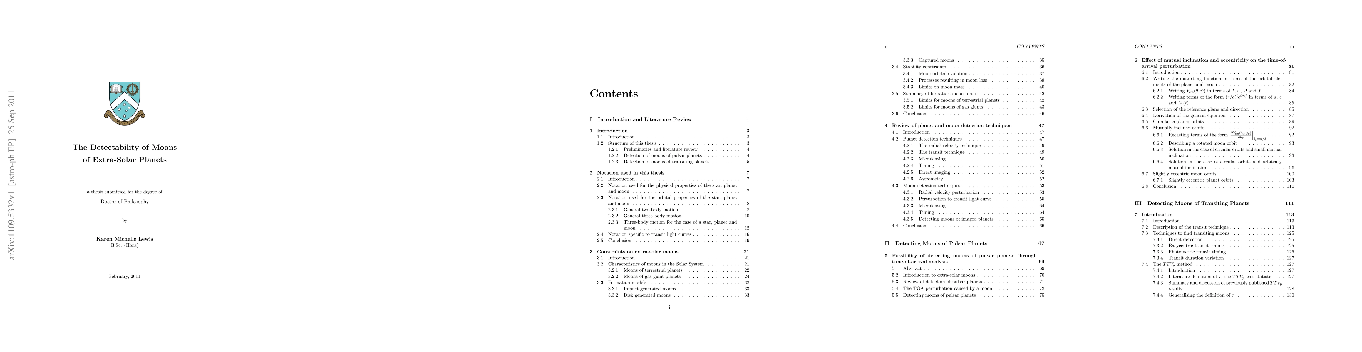 The detectability of moons of extra-solar planets is investigated, focussing on the time-of-arrival perturbation technique, a method for detecting moons of pulsar planets, and the photometric transit timing technique, a method for detecting moons of transiting planets. Realistic thresholds are derived and analysed in the in the context of the types of moons that are likely to form and be orbitally stable for the lifetime of the system. For the case of the time-of-arrival perturbation technique, the analysis is conducted in two stages. First, a preliminary investigation is conducted assuming that planet and moon's orbit are circular and coplanar. This analysis is then applied to the case of the pulsar planet PSR B1620-26 b, and used to conclude that a stable moon orbiting this pulsar planet could be detected, if its mass was >5% of its planet's mass (2.5 Jupiter masses), and if the planet-moon distance was ~ 2% of the planet-pulsar separation (23 AU). Time-of-arrival expressions are then derived for mutually inclined as well as non-circular orbits. For the case of the photometric transit timing technique, a different approach is adopted. First, analytic expressions for the timing perturbation due to the moon are derived for the case where the orbit of the moon is circular and coplanar with that of the planet and where the planet's orbit is circular and aligned to the line-of-sight, circular and inclined with respect to the line-of-sight or eccentric and aligned to the line-of-sight. Second, the timing noise is investigated analytically, for the case of white photometric noise, and numerically, using SOHO lightcurves, for the case of realistic and filtered realistic photometric noise. [...] Abstract truncated due to the limitations of astroph. See full abstract in the thesis.