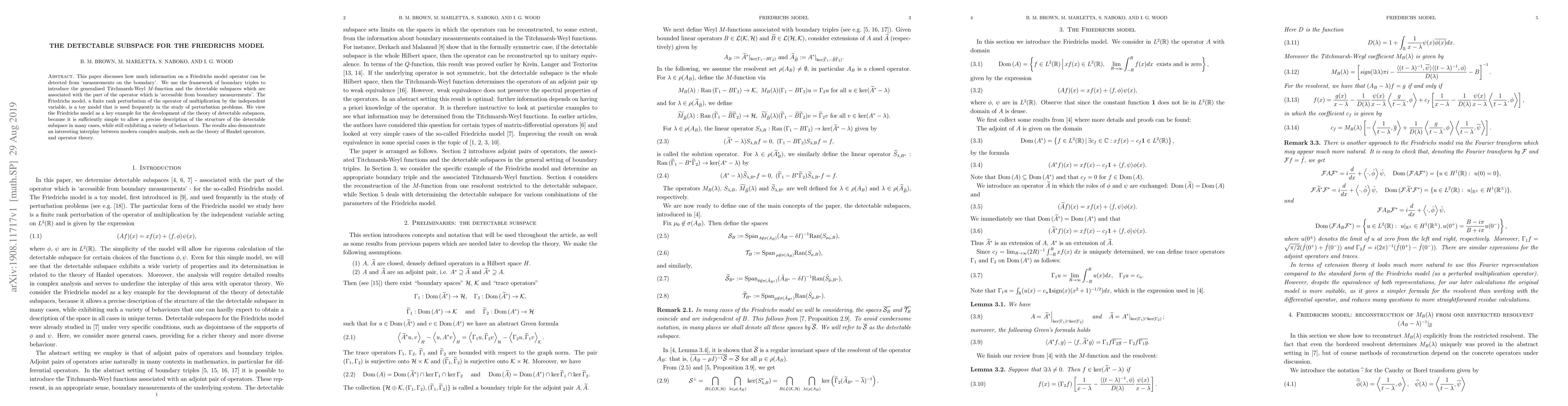 This paper explores the detectable subspaces of the Friedrichs model operator using boundary triples and the generalised Titchmarsh-Weyl $M$-function, demonstrating the interplay between complex analysis and operator theory in revealing accessible information from boundary measurements. The Friedrichs model serves as a simple yet illustrative example for developing the theory of detectable subspaces.