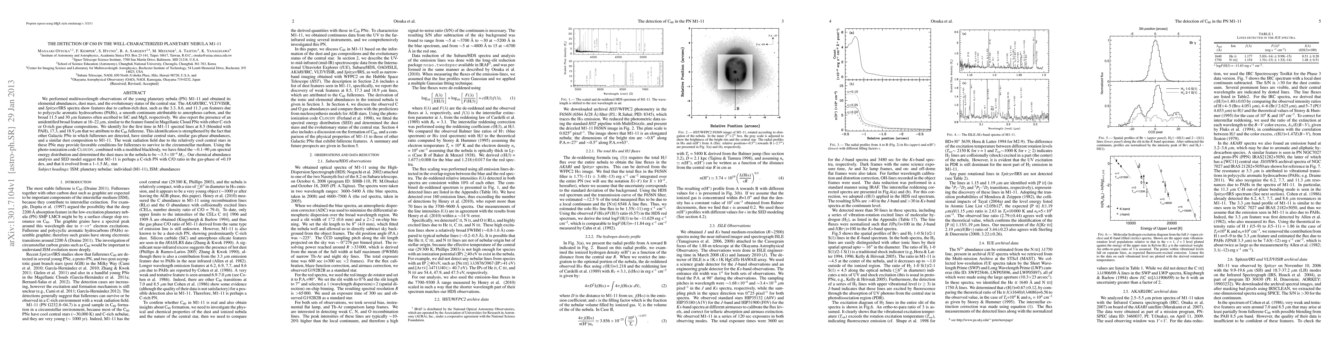 We performed multiwavelength observations of the young planetary nebula (PN) M1-11 and obtained its elemental abundances, dust mass, and the evolutionary status of the central star. The AKARI/IRC, VLT/VISIR, and Spitzer/IRS spectra show features due to carbon-rich dust, such as the 3.3, 8.6, and 11.3 um features due to polycyclic aromatic hydrocarbons (PAHs), a smooth continuum attributable to amorphous carbon, and the broad 11.5 and 30 um features often ascribed to SiC and MgS, respectively. We also report the presence of an unidentified broad feature at 16-22 um, similar to the feature found in Magellanic Cloud PNe with either C-rich or O-rich gas-phase compositions. We identify for the first time in M1-11 spectral lines at 8.5 (blended with PAH), 17.3, and 18.9 um that we attribute to the C60 fullerene. This identification is strengthened by the fact that other Galactic PNe in which fullerenes are detected, have similar central stars, similar gas-phase abundances, and a similar dust composition to M1-11. The weak radiation field due to the relatively cool central stars in these PNe may provide favorable conditions for fullerenes to survive in the circumstellar medium. Using the photo-ionization code CLOUDY, combined with a modified blackbody, we have fitted the ~0.1-90 um spectral energy distribution and determined the dust mass in the nebula to be ~3.5x10^{-4} Msun$. Our chemical abundance analysis and SED model suggest that M1-11 is perhaps a C-rich PN with C/O ratio in the gas-phase of +0.19 dex, and that it evolved from a 1-1.5 Msun star.