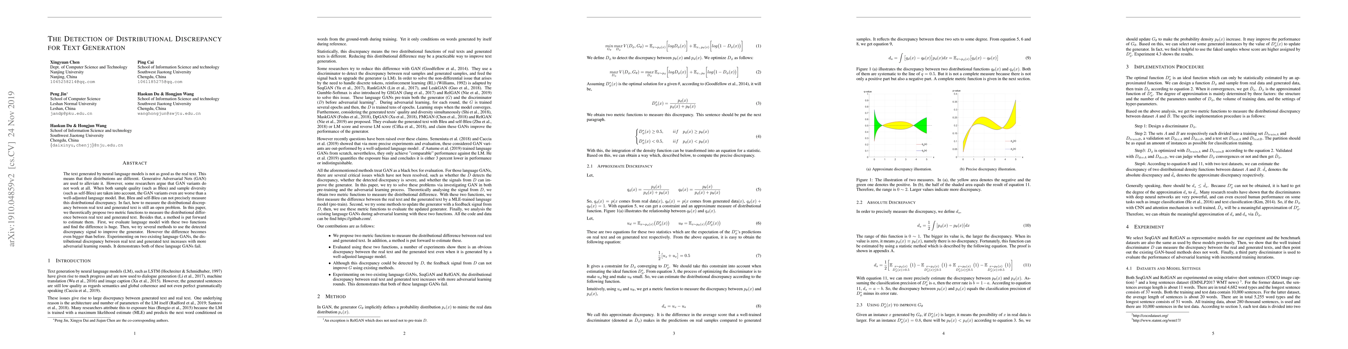 The text generated by neural language models is not as good as the real text. This means that their distributions are different. Generative Adversarial Nets (GAN) are used to alleviate it. However, some researchers argue that GAN variants do not work at all. When both sample quality (such as Bleu) and sample diversity (such as self-Bleu) are taken into account, the GAN variants even are worse than a well-adjusted language model. But, Bleu and self-Bleu can not precisely measure this distributional discrepancy. In fact, how to measure the distributional discrepancy between real text and generated text is still an open problem. In this paper, we theoretically propose two metric functions to measure the distributional difference between real text and generated text. Besides that, a method is put forward to estimate them. First, we evaluate language model with these two functions and find the difference is huge. Then, we try several methods to use the detected discrepancy signal to improve the generator. However the difference becomes even bigger than before. Experimenting on two existing language GANs, the distributional discrepancy between real text and generated text increases with more adversarial learning rounds. It demonstrates both of these language GANs fail.